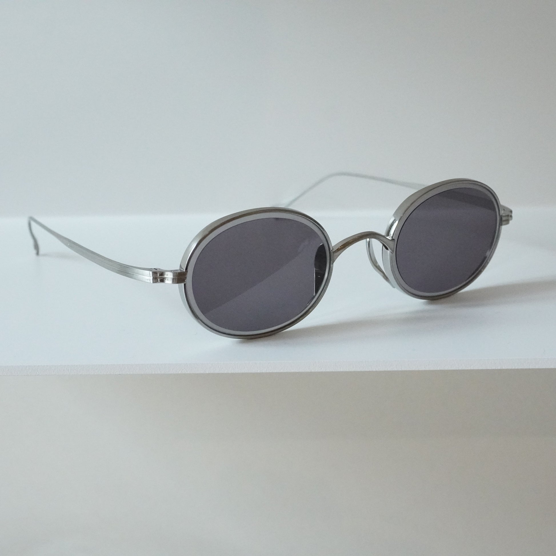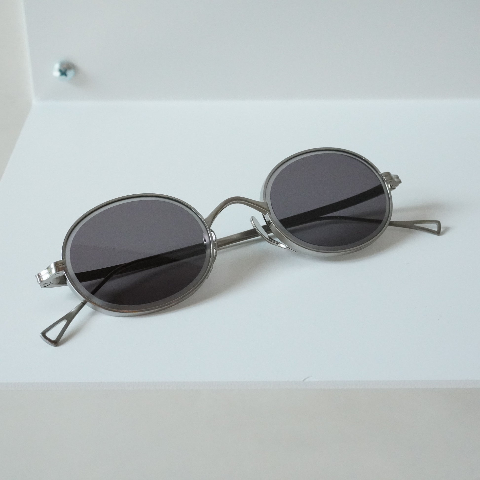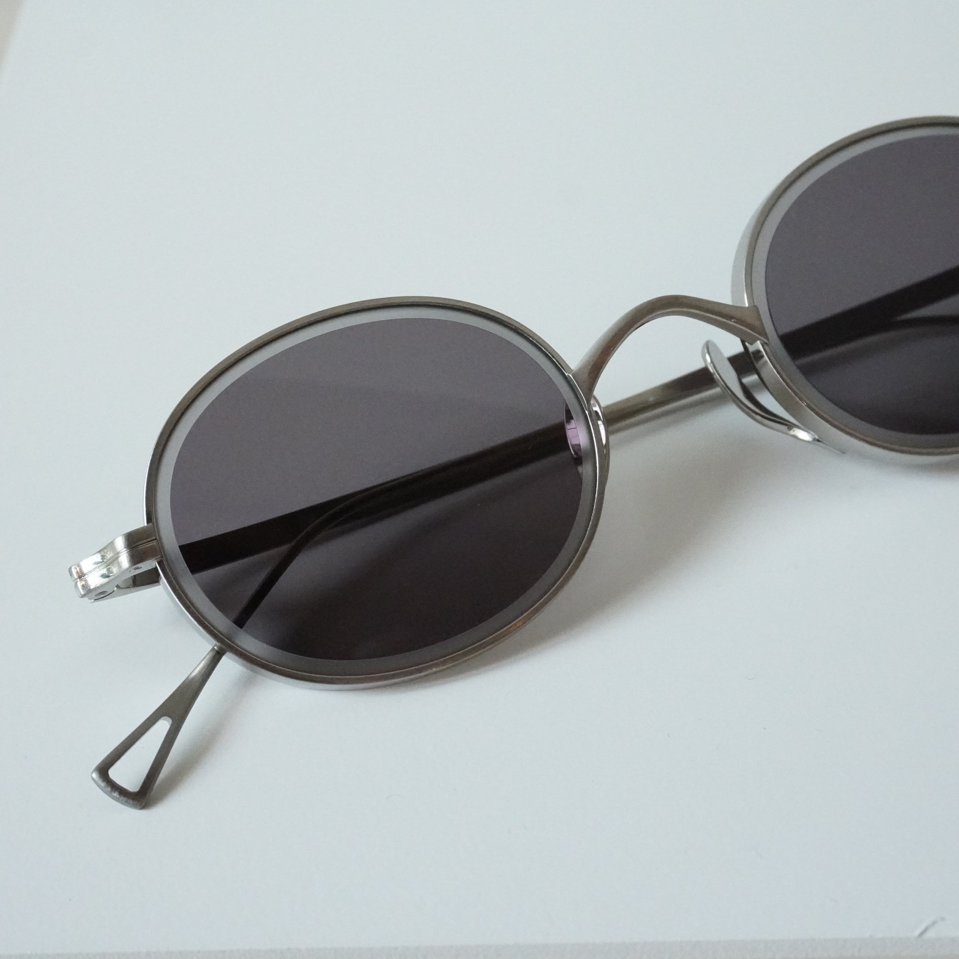太阳镜采用椭圆形厚框设计。这是一款散发着独特气息的专业产品编号。 KameManNen 的原创镜片是采用全钛材质的舒适型号,通过刮擦外周呈现出不同质感的大胆镜片规格。