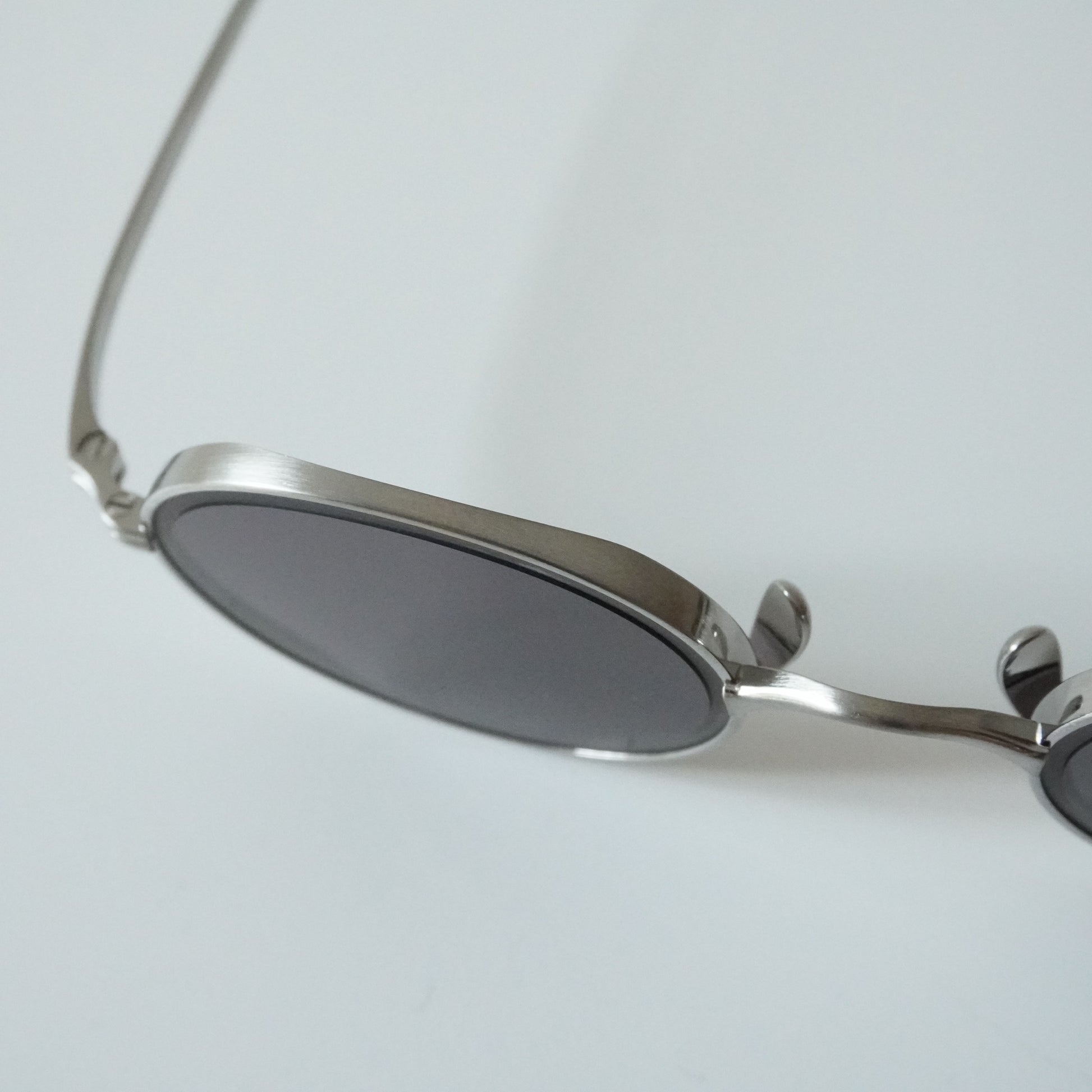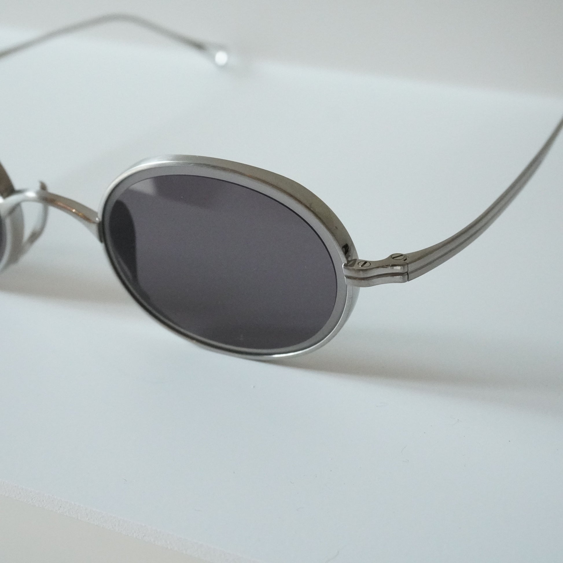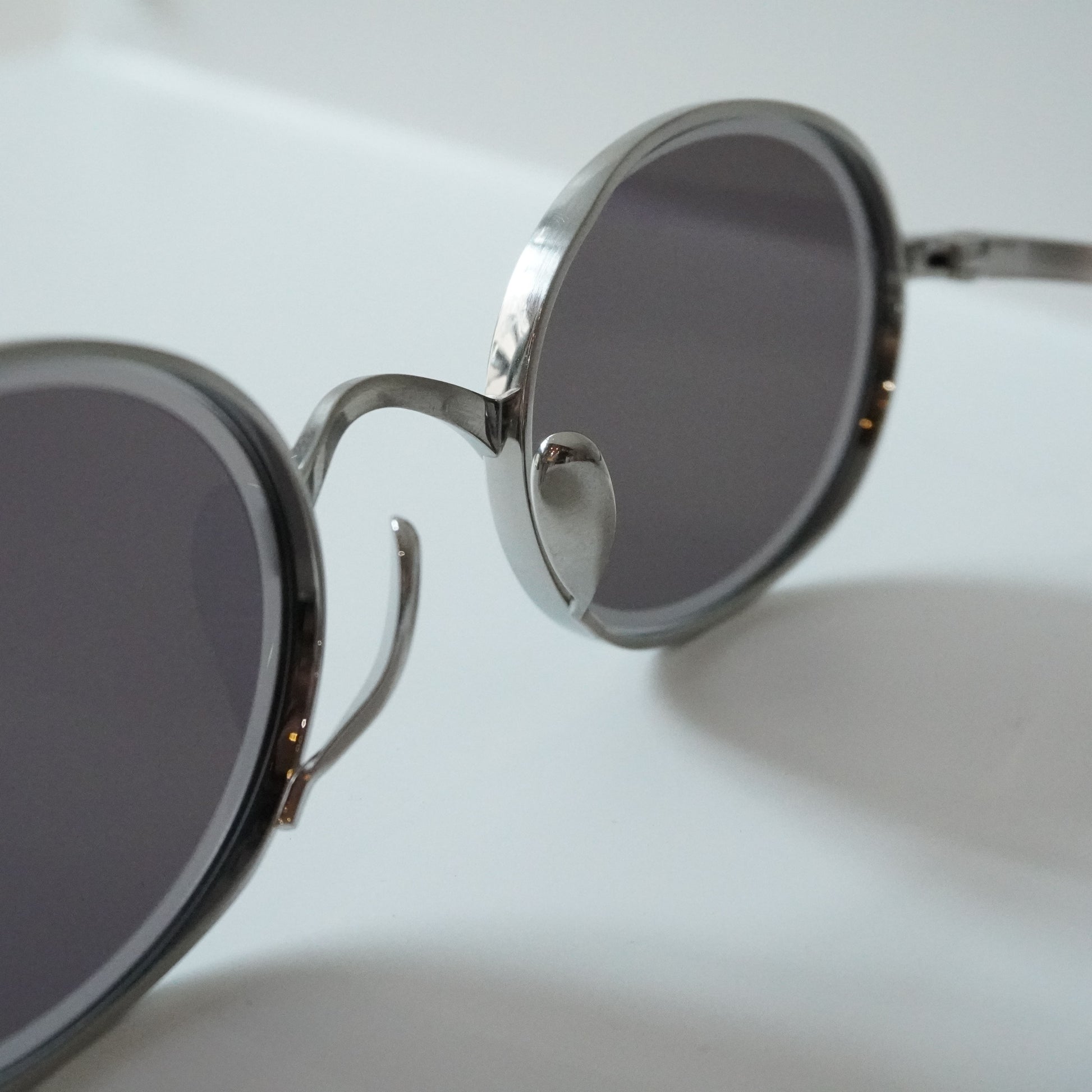 太阳镜采用椭圆形厚框设计。这是一款散发着独特气息的专业产品编号。 KameManNen 的原创镜片是采用全钛材质的舒适型号,通过刮擦外周呈现出不同质感的大胆镜片规格。