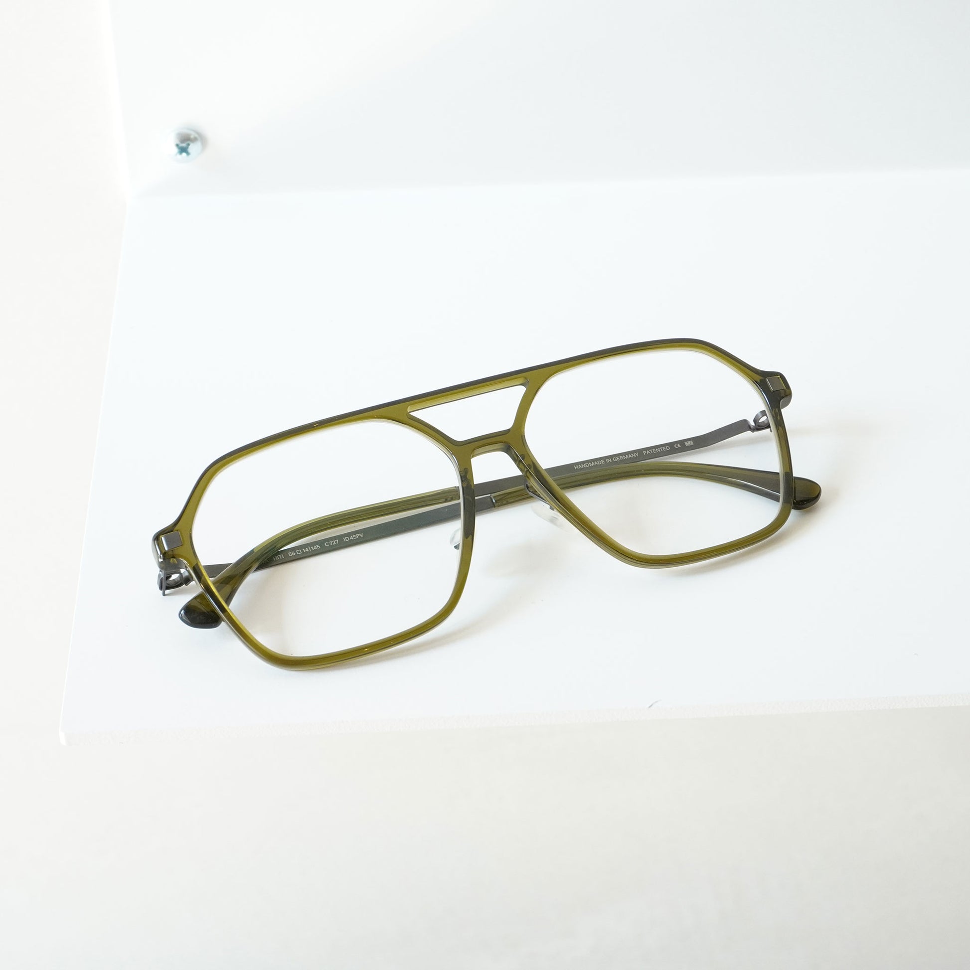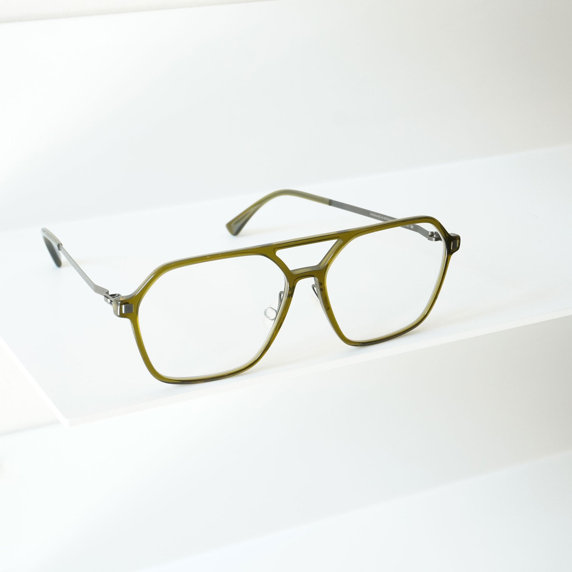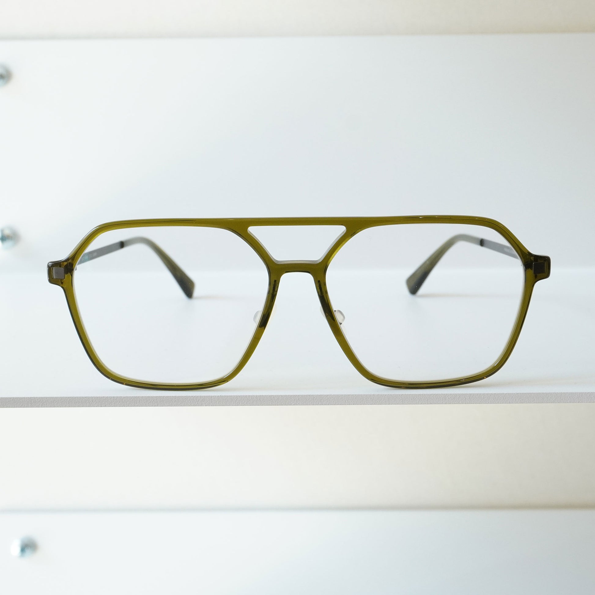 由醋酸纤维材料制成的细长两桥框架。虽然镜头尺寸较大,但简单的设计使其易于悬挂。细长醋酸纤维框架正面获得专利的螺旋铰链,类似 Mykita 的眼镜,配有超轻不锈钢镜腿。