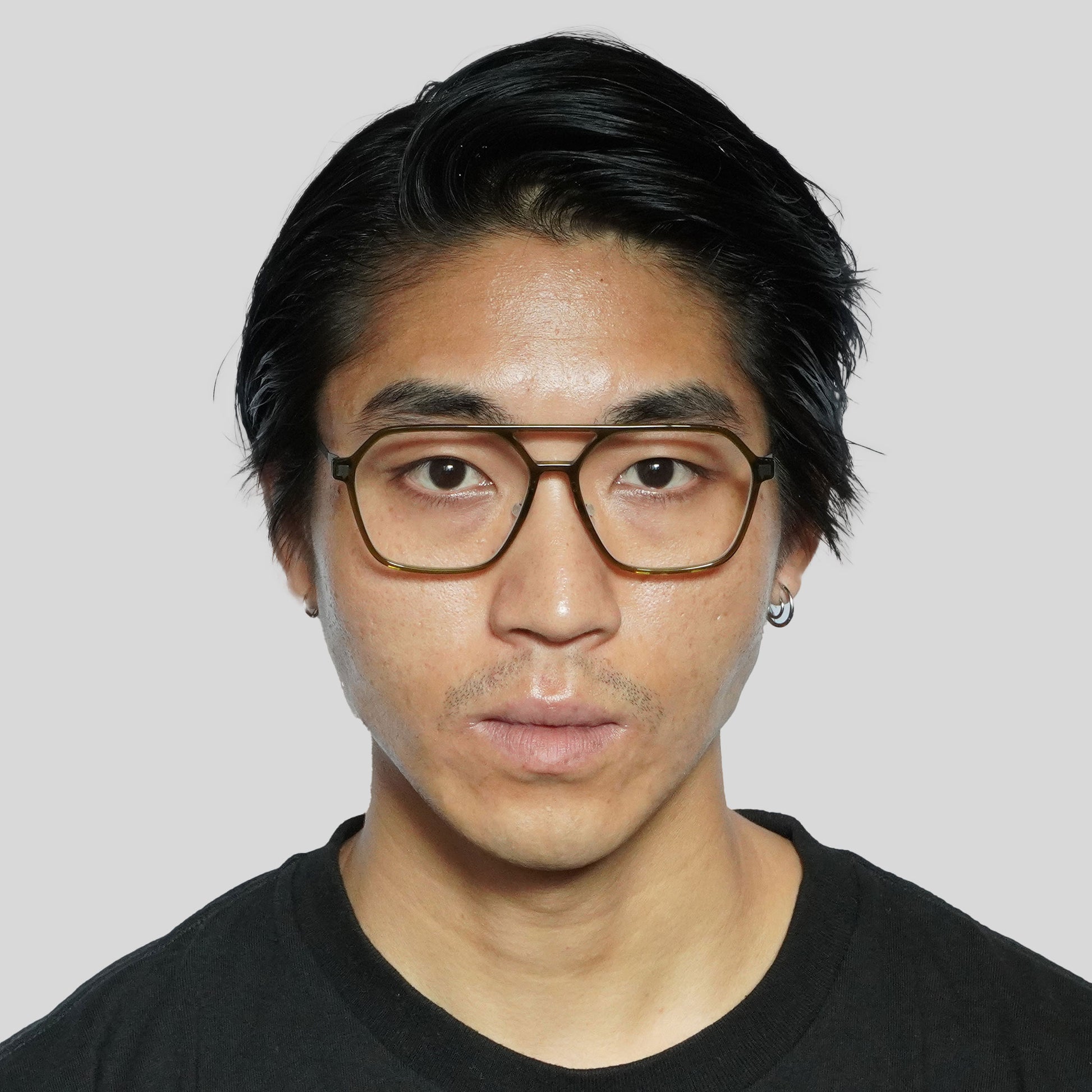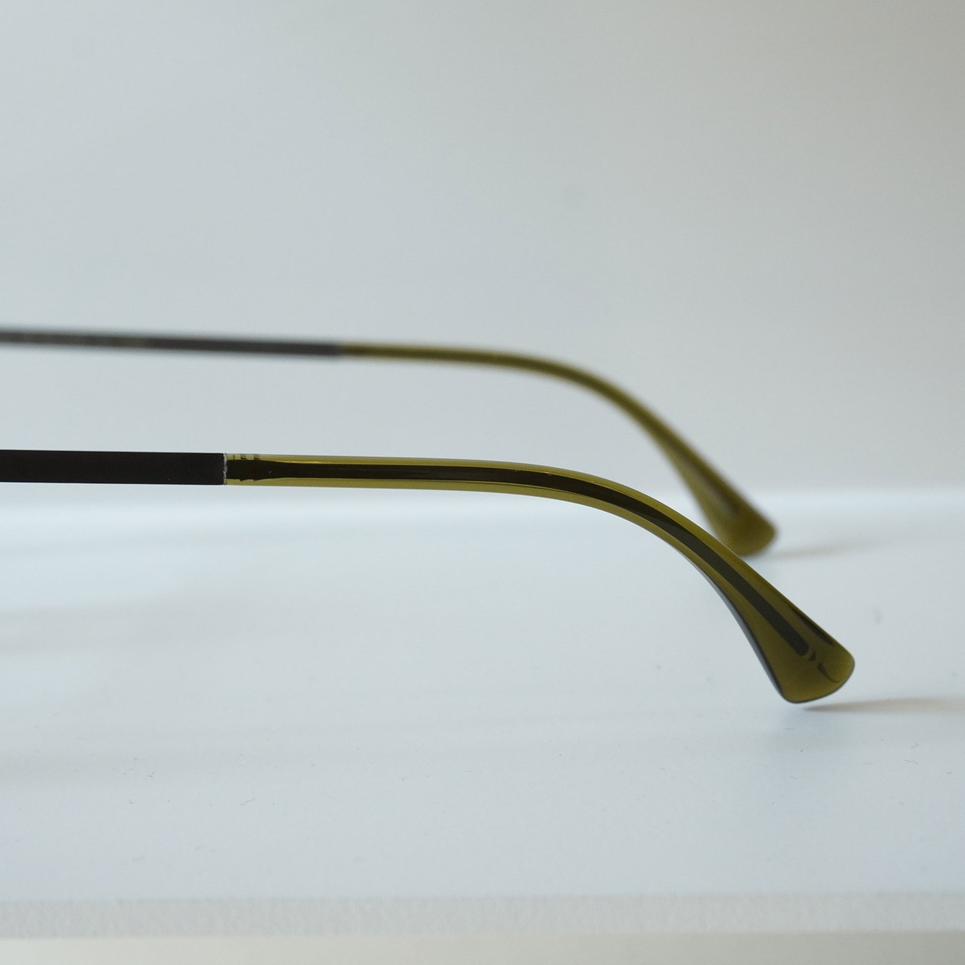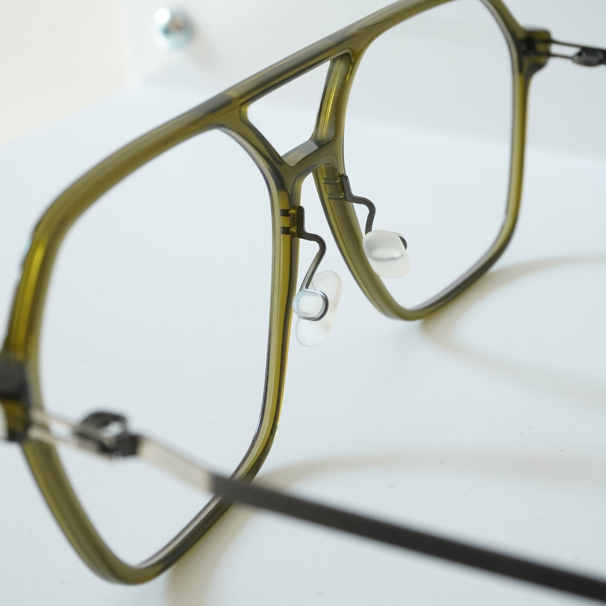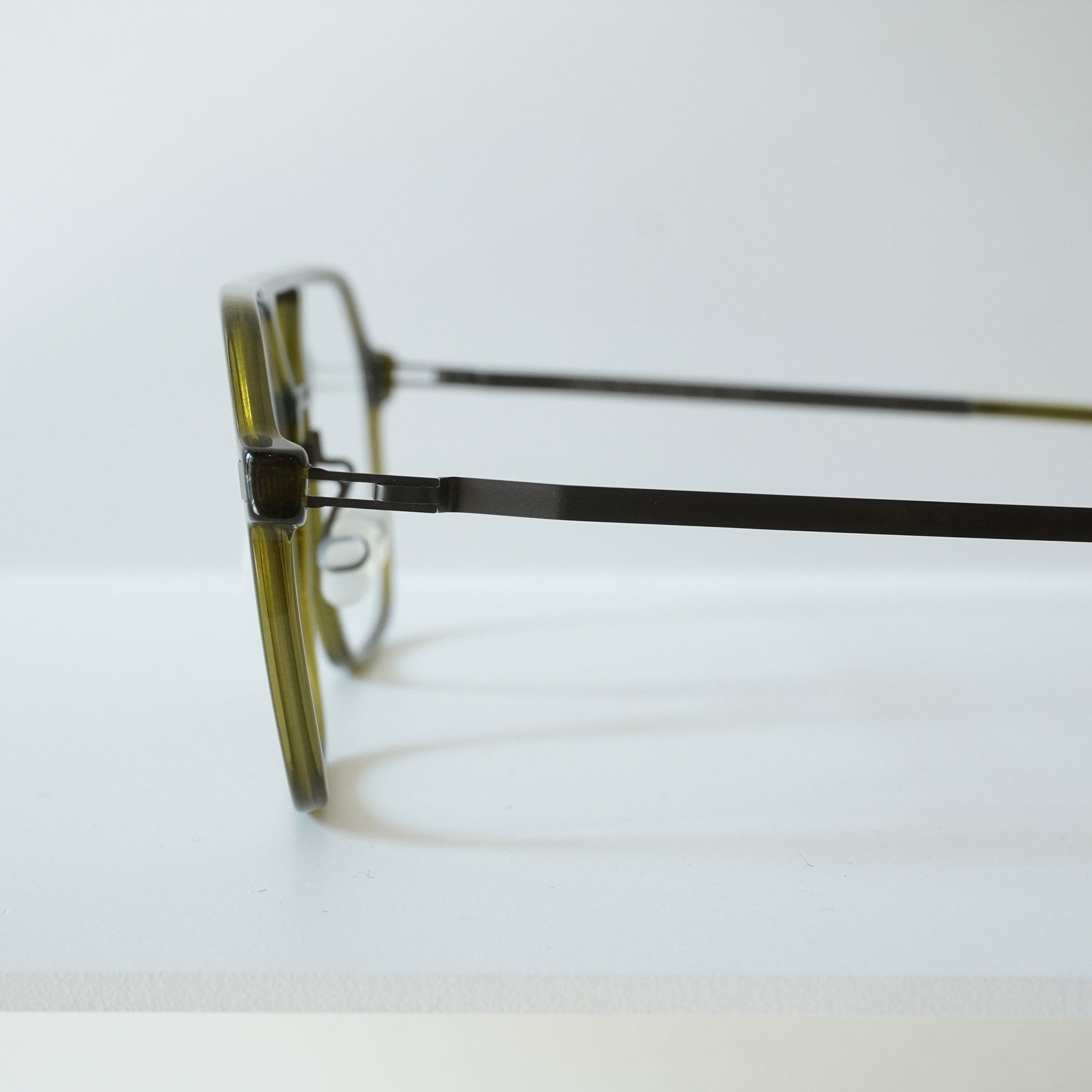 由醋酸纤维材料制成的细长两桥框架。虽然镜头尺寸较大,但简单的设计使其易于悬挂。细长醋酸纤维框架正面获得专利的螺旋铰链,类似 Mykita 的眼镜,配有超轻不锈钢镜腿。