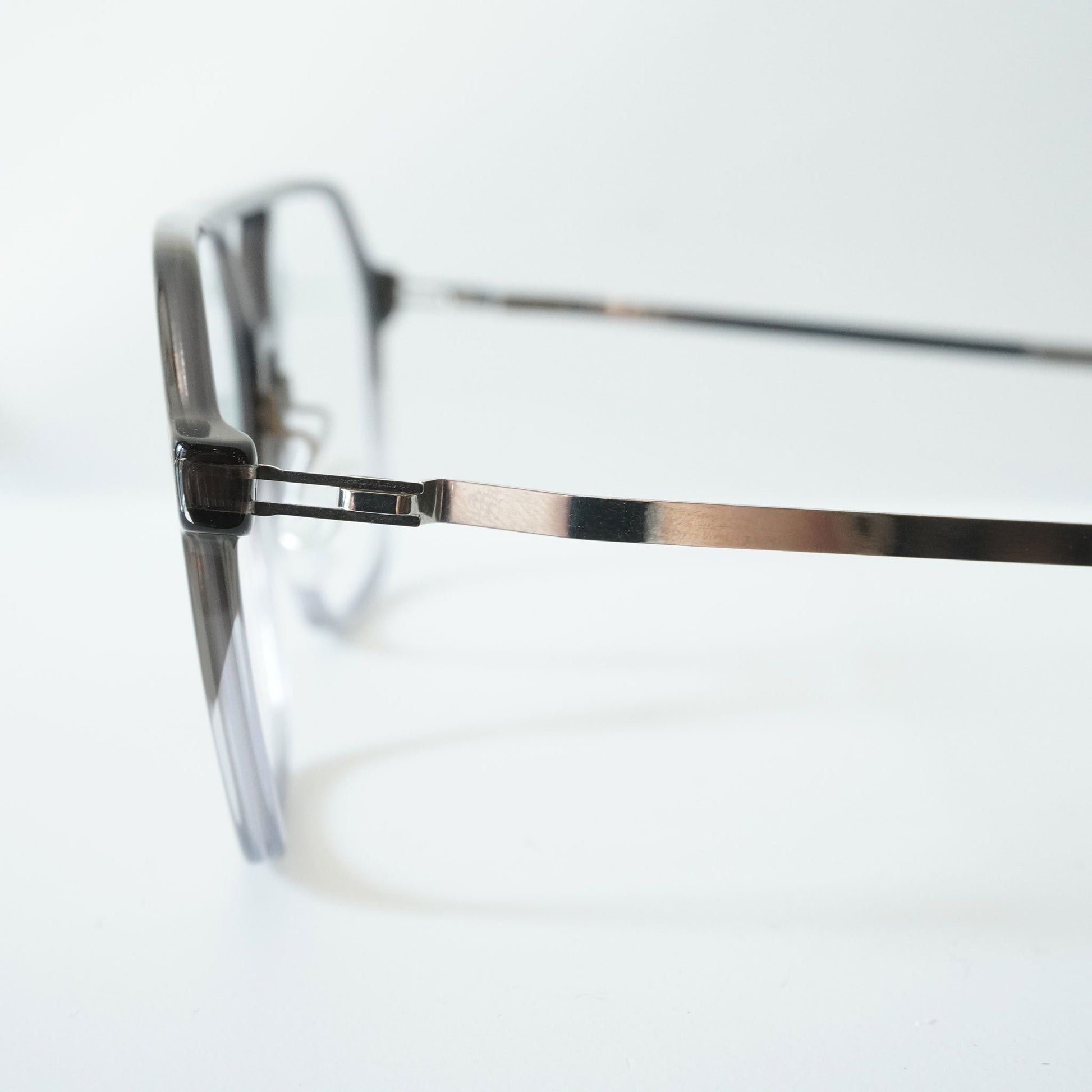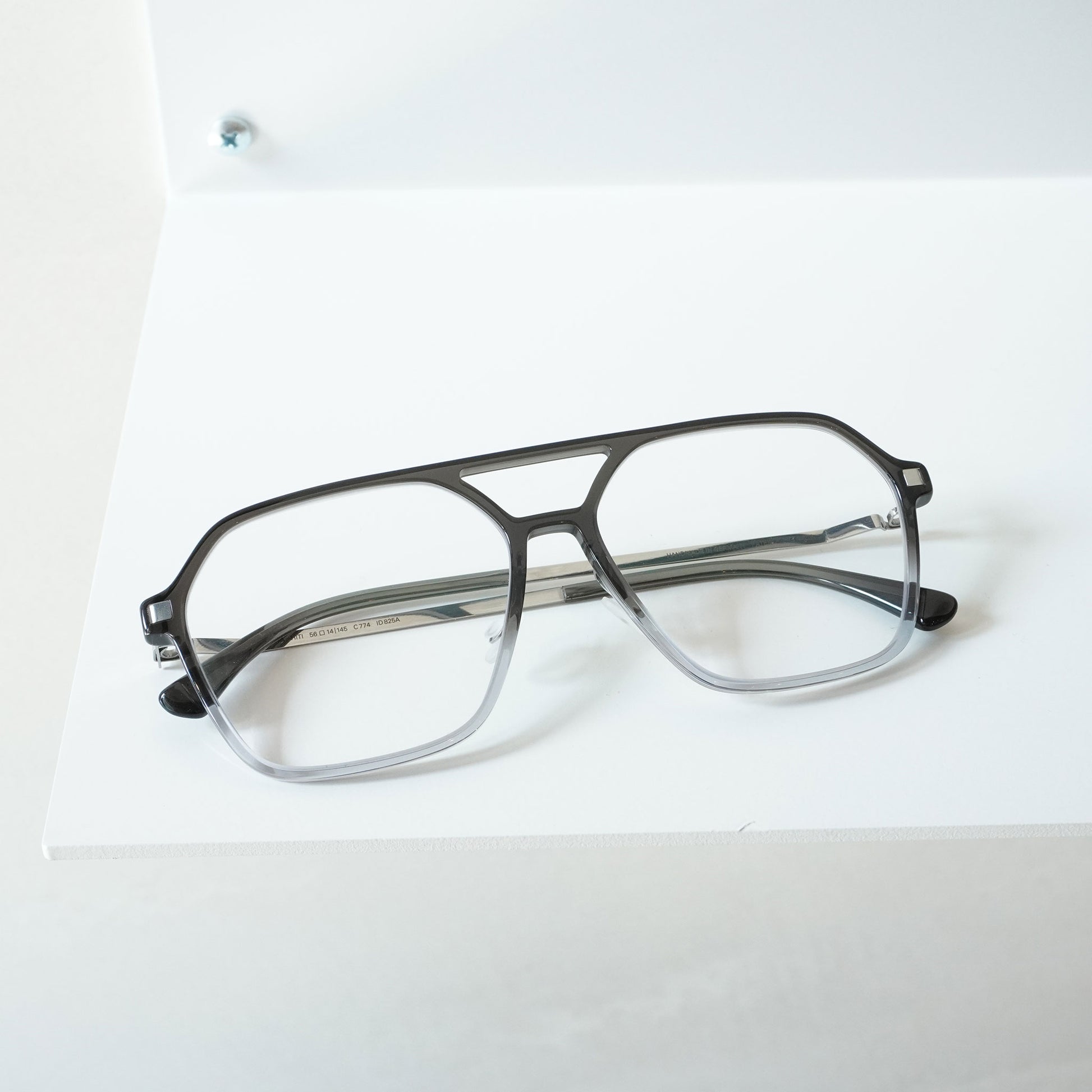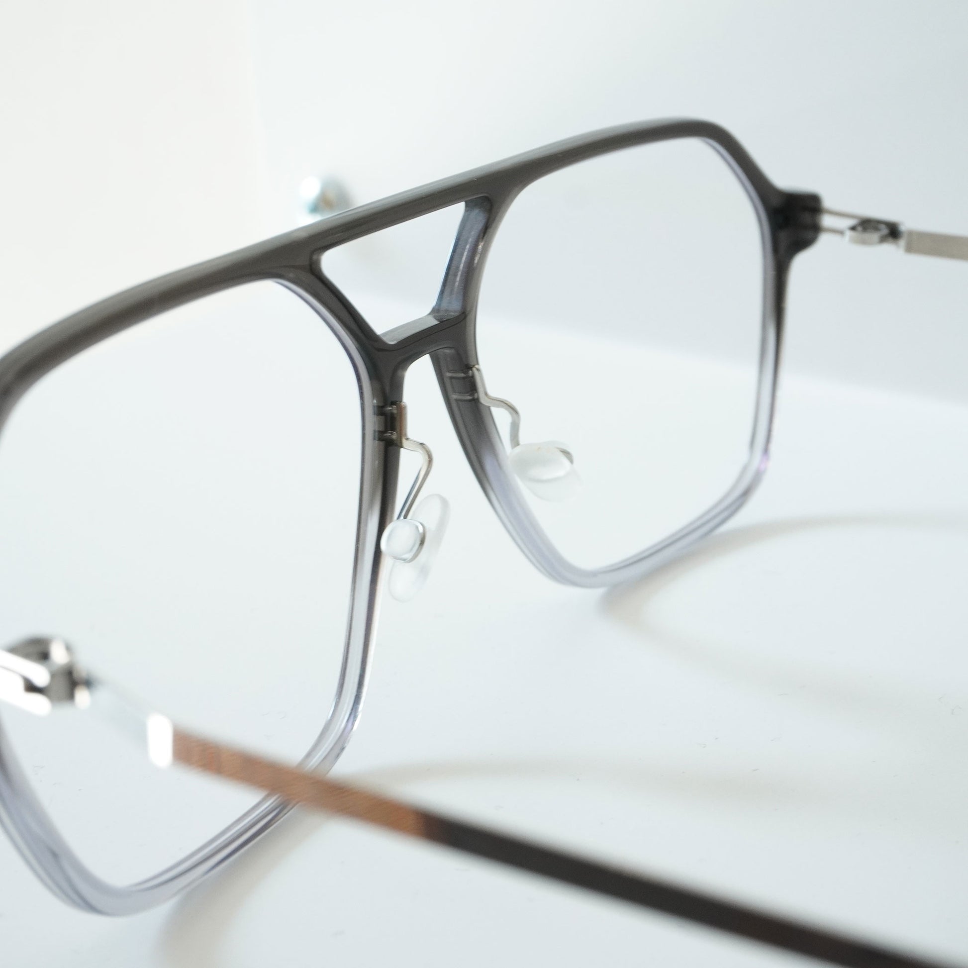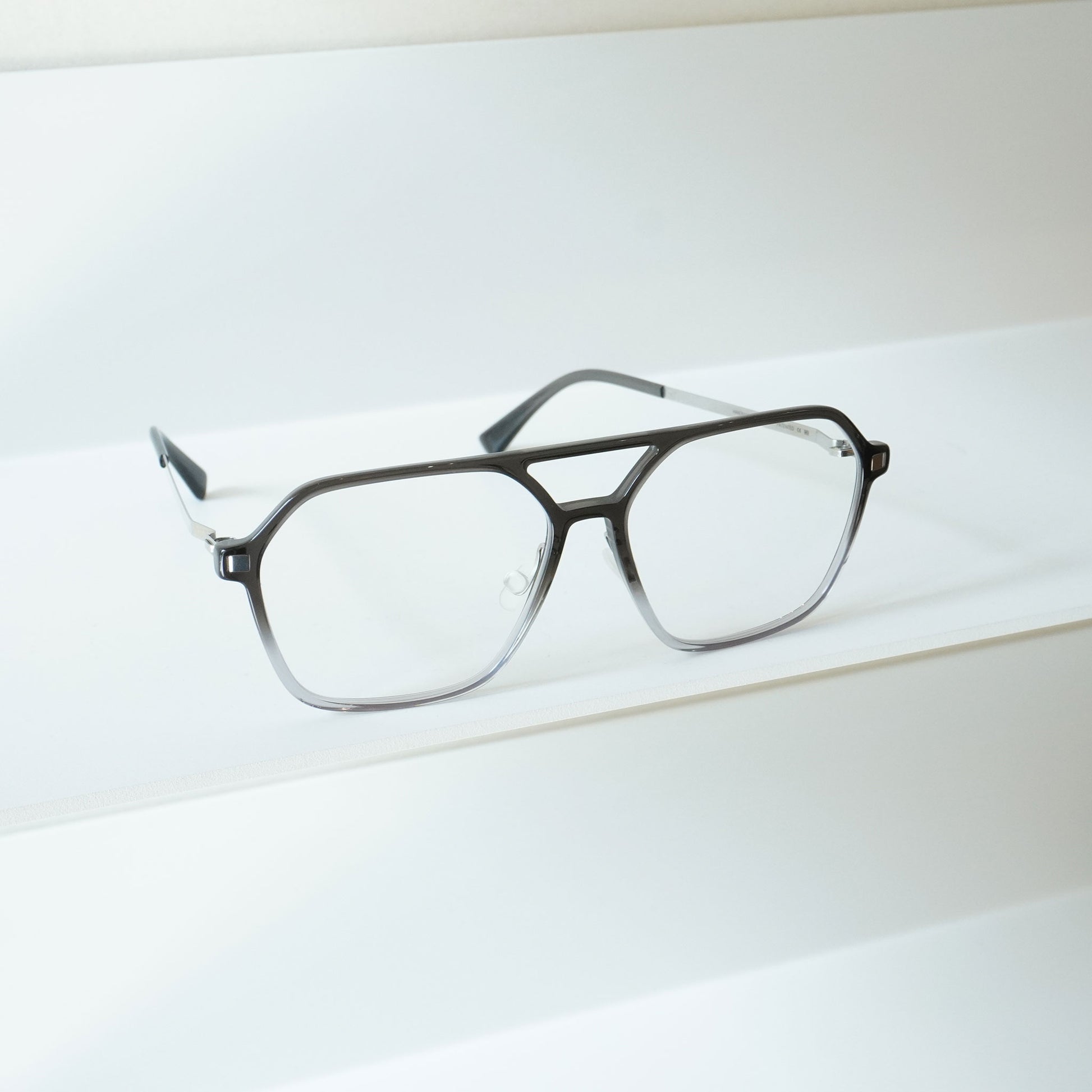 由醋酸纤维材料制成的细长两桥框架。虽然镜头尺寸较大,但简单的设计使其易于悬挂。细长醋酸纤维框架正面获得专利的螺旋铰链,类似 Mykita 的眼镜,配有超轻不锈钢镜腿。