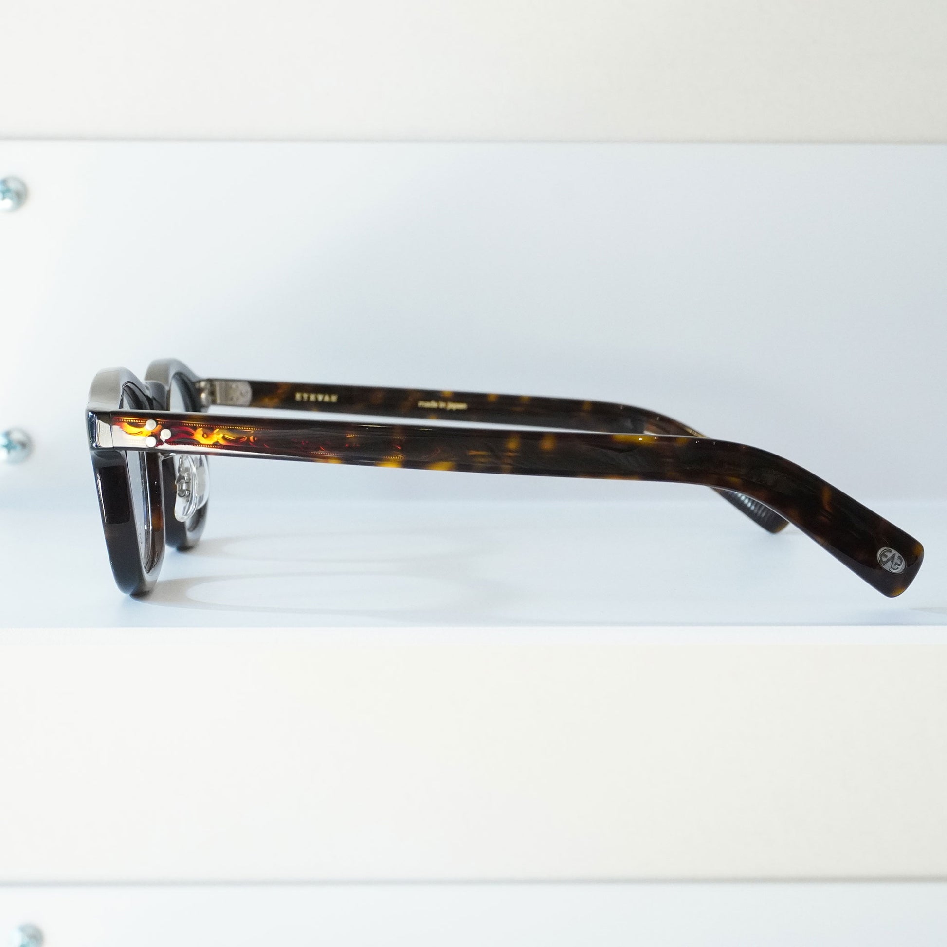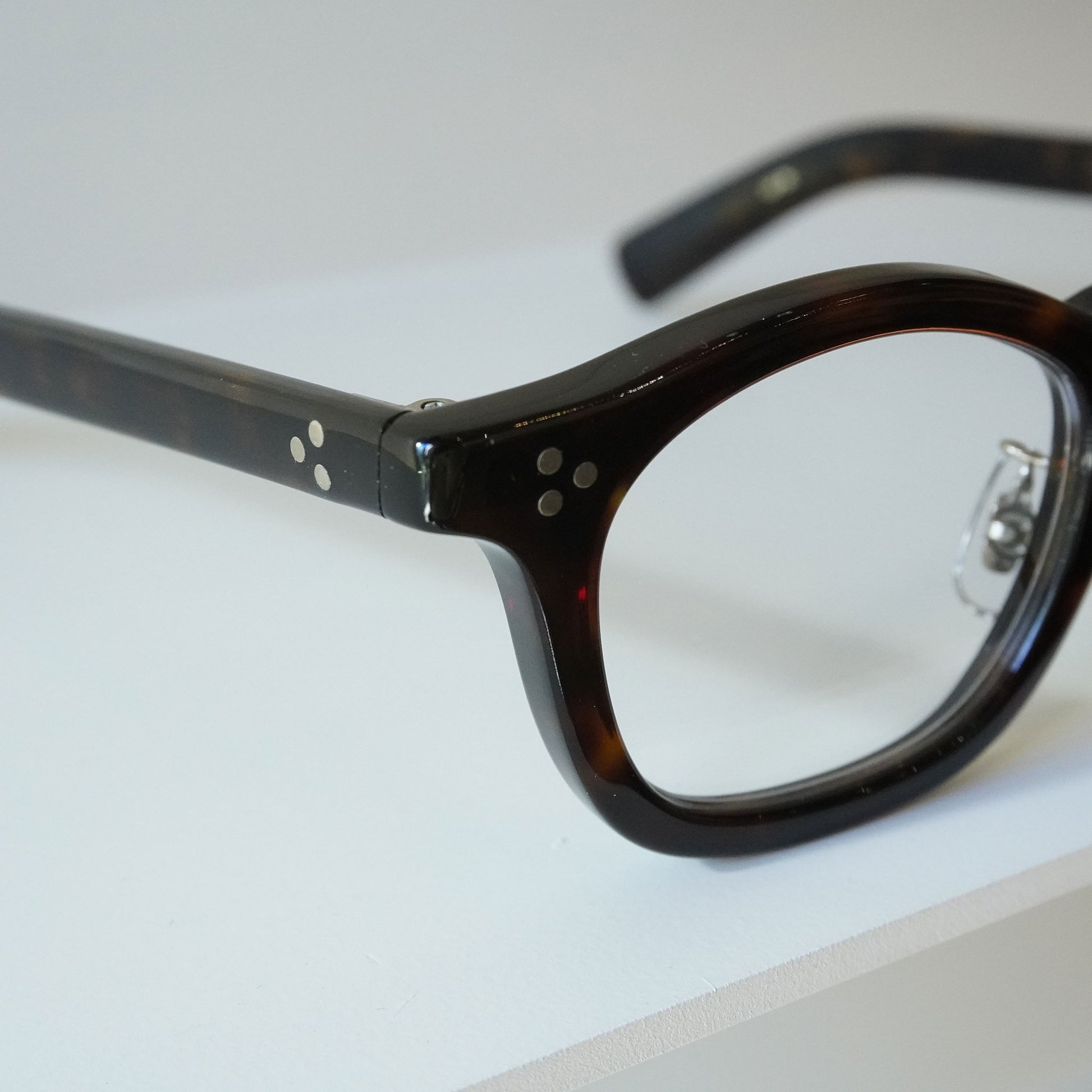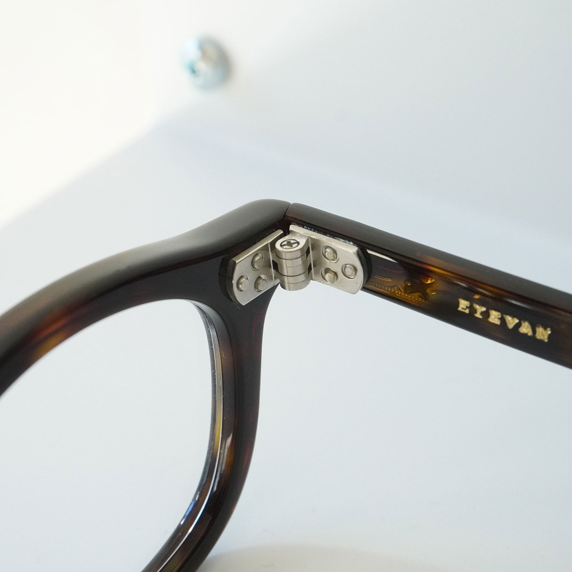 该款式的设计灵感源自法国复古风格,采用 EYEVAN 风格设计,正面厚重前卫,镜腿极粗宽大。正面和镜腿铰链是 EYEVAN 三角形基座铰链的原始复制品,该铰链用于工厂闲置的复古样品中。填缝 PIN 使用 90 年代使用的加固部件来防止其脱落。虽然简单,但还是很注重细节。