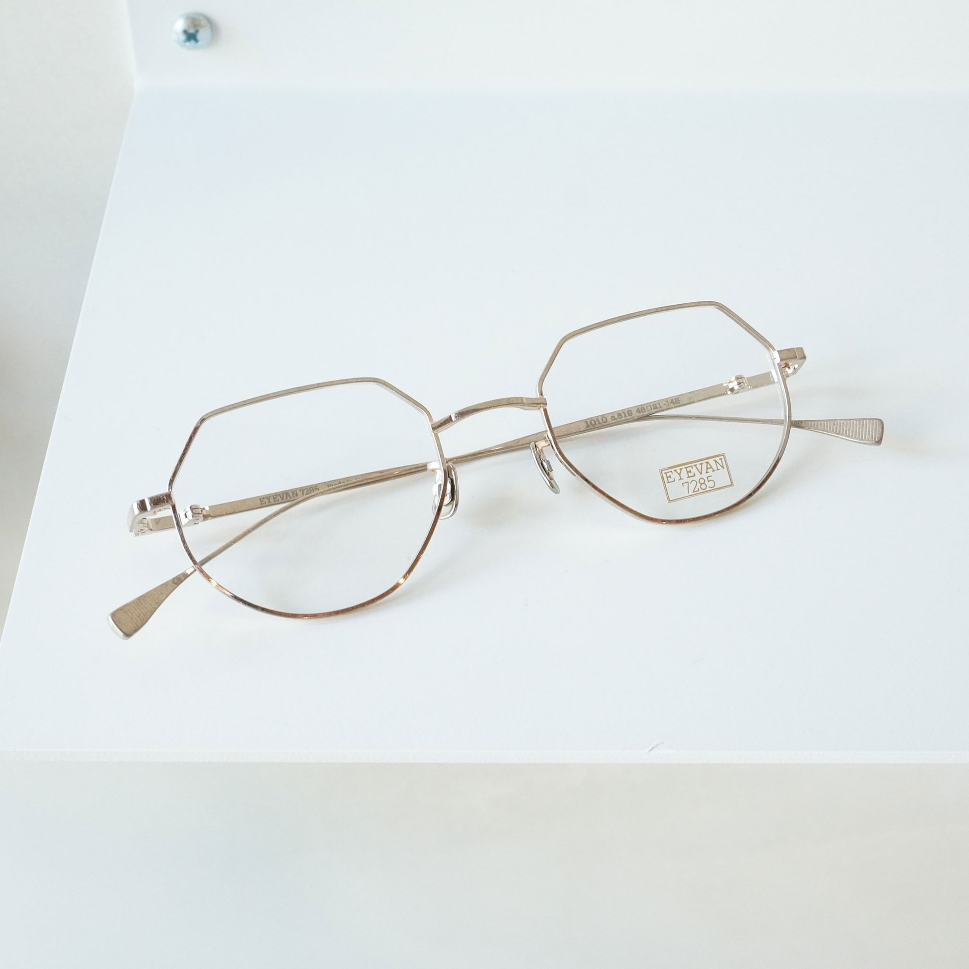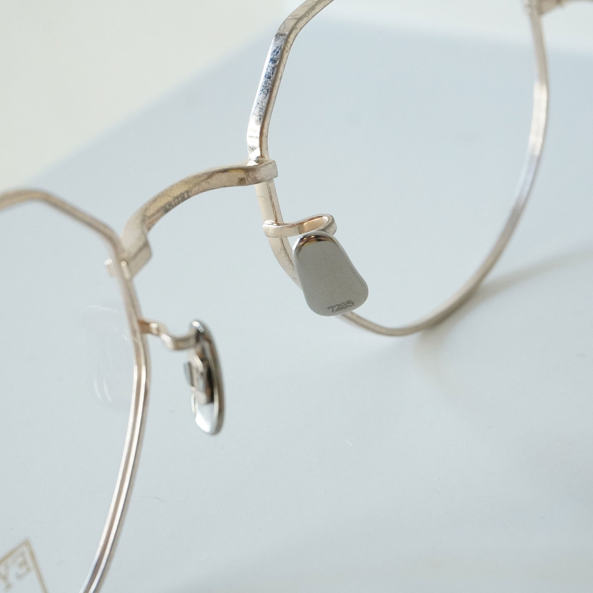 25SSシーズンで採用した1935年に発行されたアメリカのヒストリカルな眼鏡メーカーのカタログからサンプリングした玉型を本モデル「1010」でも用いた。テンプルに施された特徴的な部位は“エクステンションヒンジ(延長丁番)”と呼称する新しいパーツ。 この部品を外すとテンプル長が10mm短くなるという機能的な仕組み。デザインプロセスとしては、まずイメージする理想的な外観があり、そこに後付けで機能的な意義を付加するという手法。7285のテーマである“今自分たちが本当に美しいと思えるものを形にする”というものづくりにおいて美意識が常に先行するというイデオロギーを具現化したモデル。サングラスは色味の調合を金属の粒子などを混ぜ合わせて調色し、溶解後に一枚ずつ成形して製作する日本製ガラスレンズのオリジナル“アイヴァンカーブレンズ”を採用。