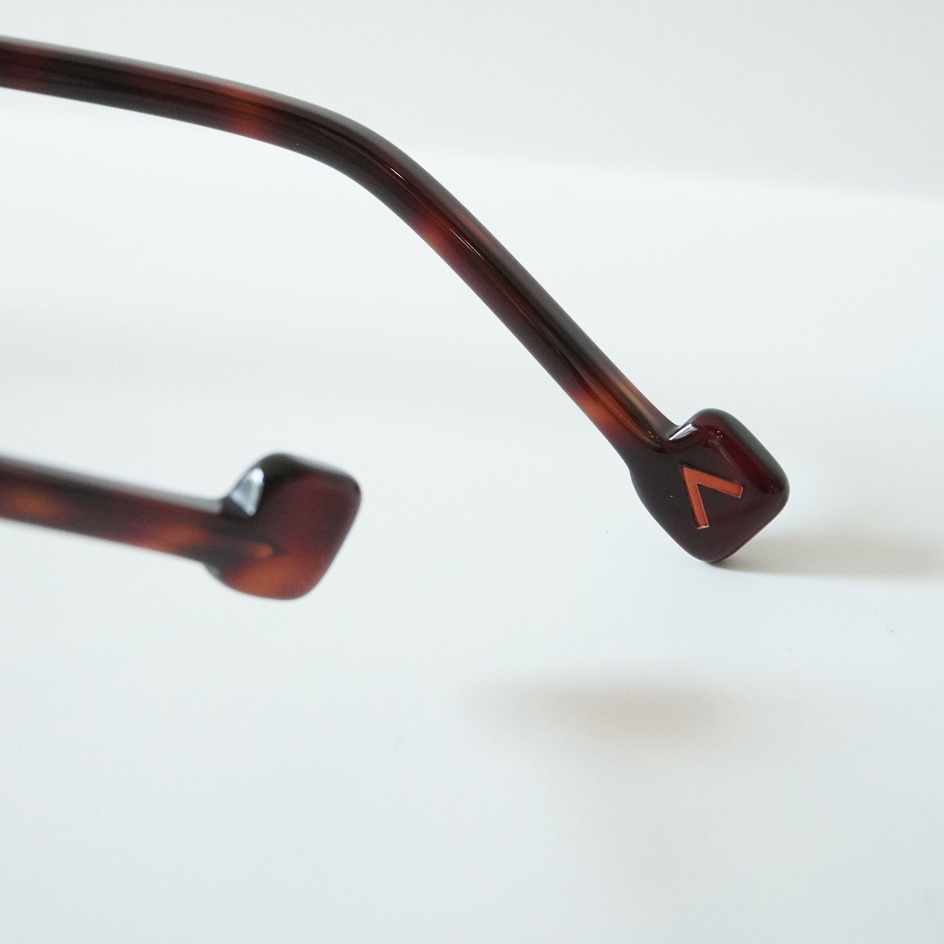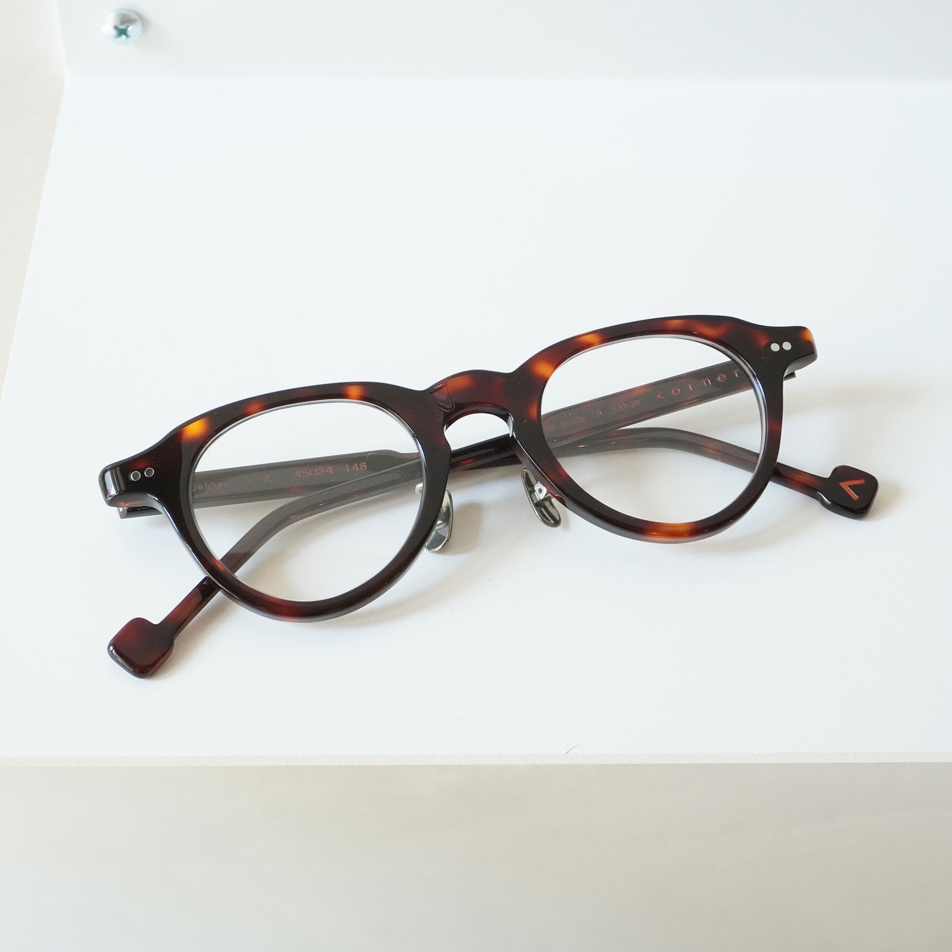掛け心地もよく調整可能なクリングスパッド、テンプルエンドはCornerのアイコンとなる正方形のデザインに「<」の刻印がされています。