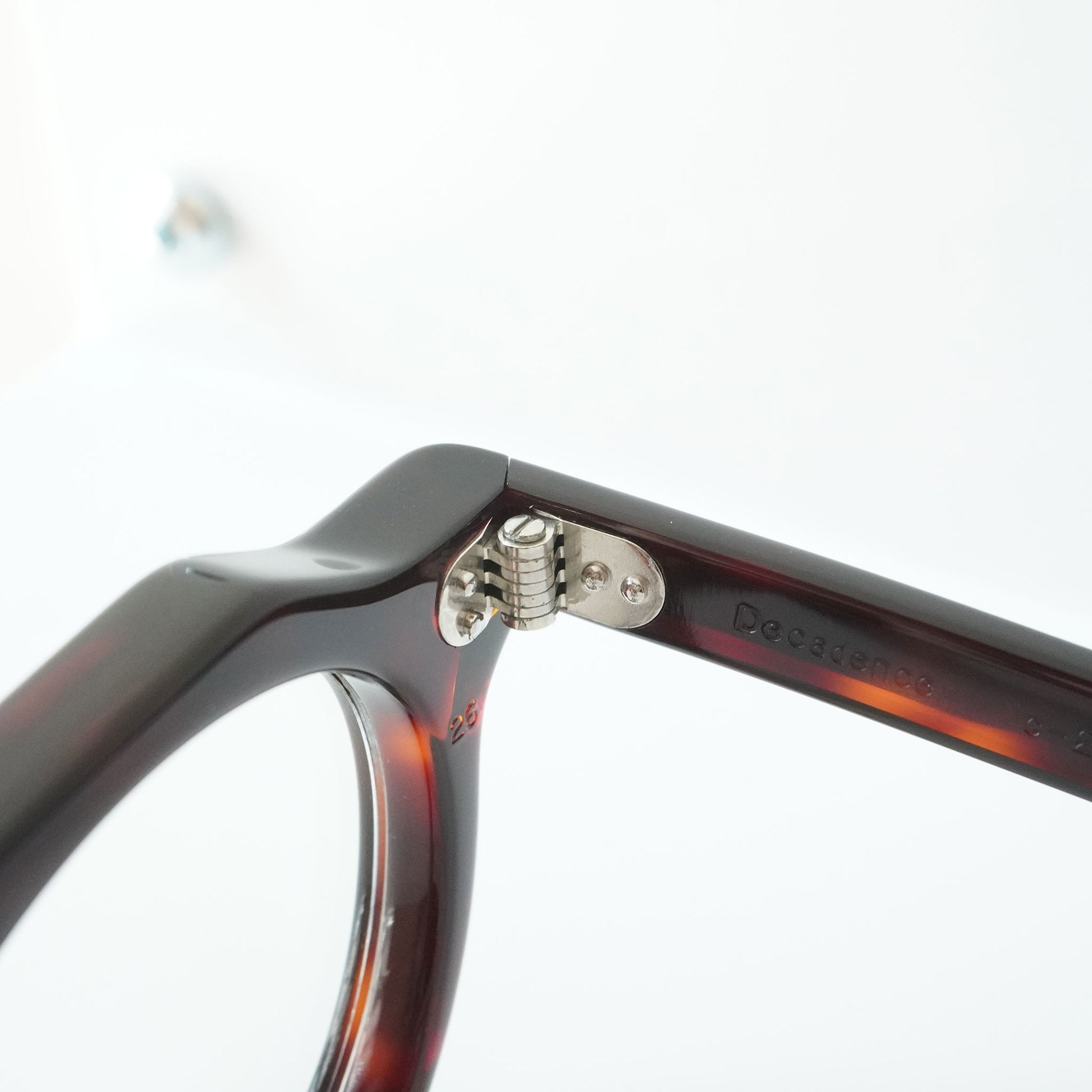 フレンチヴィンテージの代表的な形クラウンパントをベースにしたモデル。リムはボリューミーな7mm厚で存在感のある仕上がりです。エッジを立てすぎないバランスのいいメガネです。モデル名にもなっている「Decadence」は19世紀のフランスに存在したアーティスト一派。彼らの芸術至上主義的な概念にある「芸術のための芸術」という言葉が示すように、いかなる実用的な機能とも切り離された真のデザインを追求したモデルとなっています。