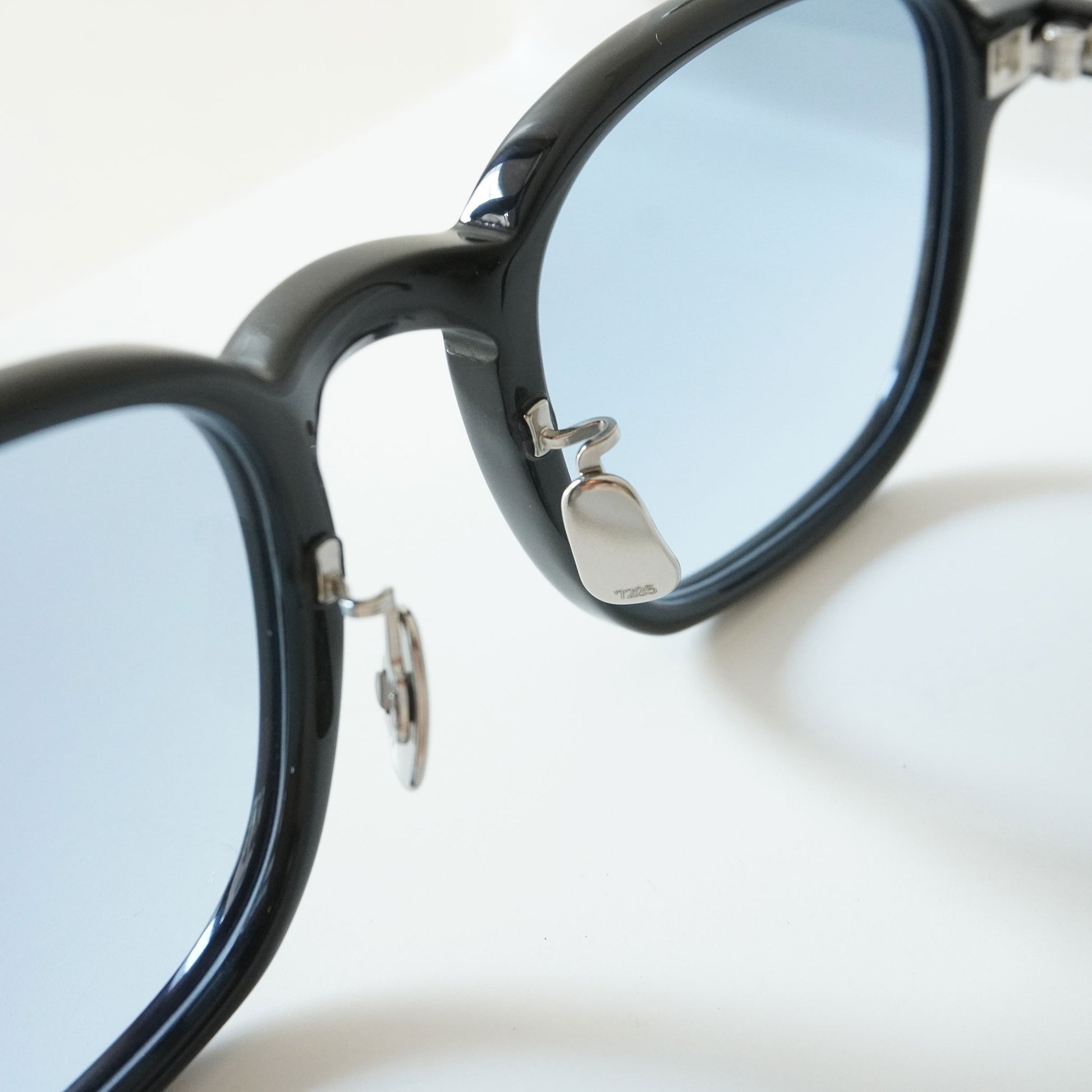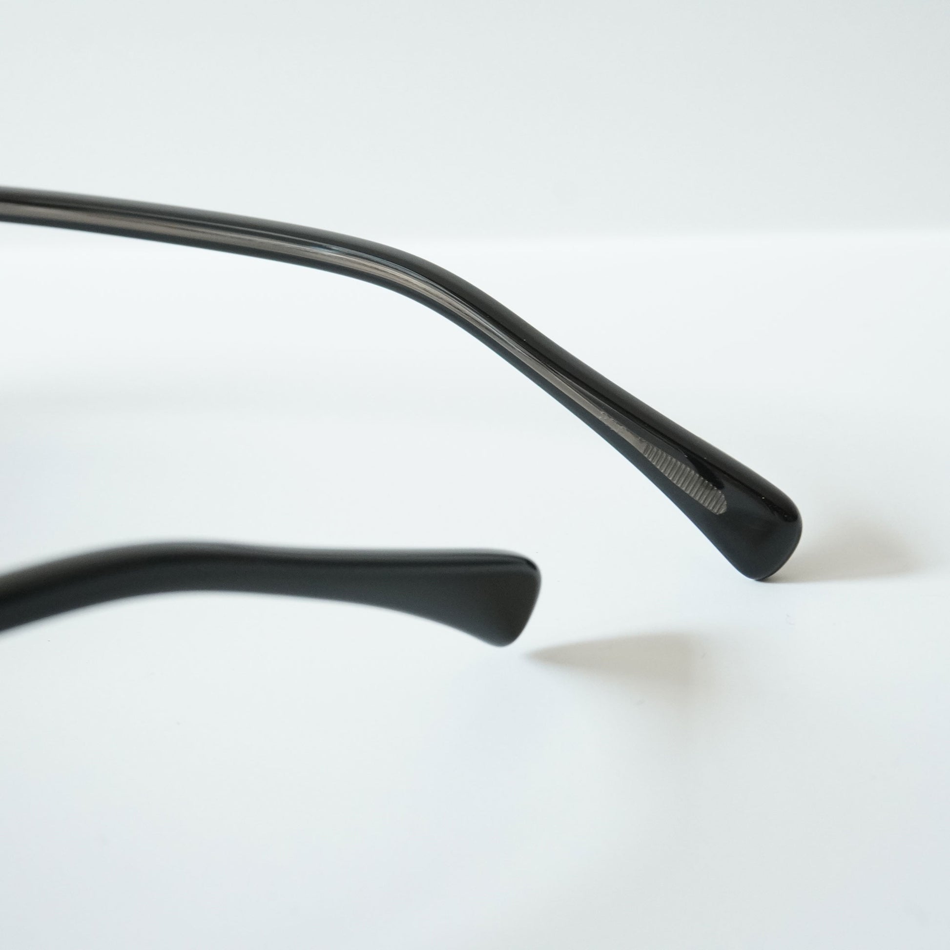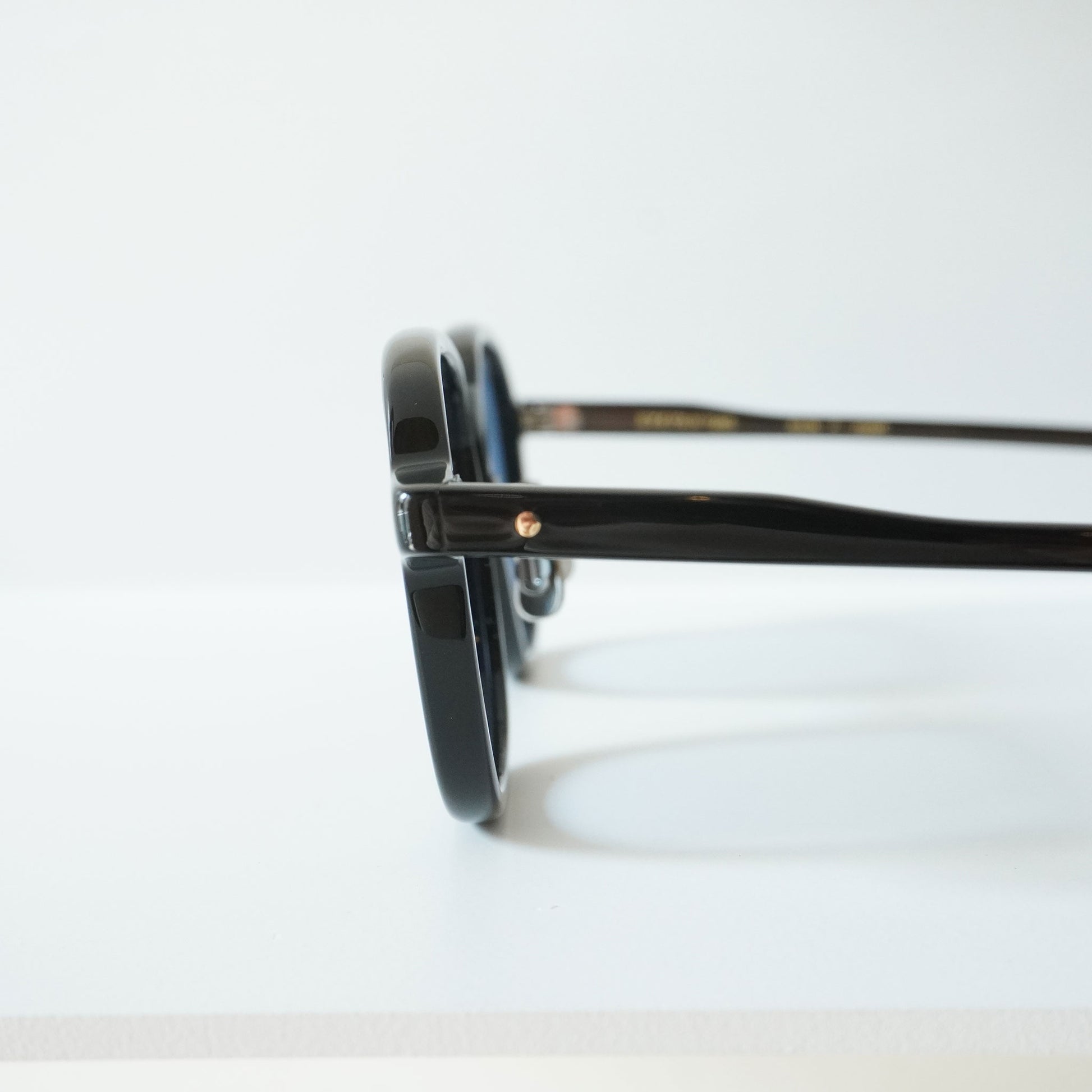 25SSでリリースした「365」型芯張りテンプルを採用したモデル。やや下がった智と柔らかい線で構成された温かみのあるスクエア シェイプは工場で使用する“カニメ”という呼称の治具に形が近いことから蟹目型と呼ばれている。合口部に向けて膨らんだ形状を有したテンプルは50年代のフレンチヴィンテージからサンプリングしたもの。華美なテンプル芯を見せることを目的とした芯張りではなく、シューティングでは作れない特徴的なテンプルのアウトラインを具現化する手段としてこの製法を用いた。ブランドのシグネチャーとなる埋め込み丁番1PINカシメ構造はK10のリベットを採用。執拗なまでのこだわりや創作思考を基調としながらも完成像は極めて静かな存在感に収めている。サングラスは色味の調合を金属の粒子などを混ぜ合わせて調色し、溶解後に一枚ずつ成形して製作する日本製ガラスレンズのオリジナル“アイヴァンカーブレンズ”を採用。