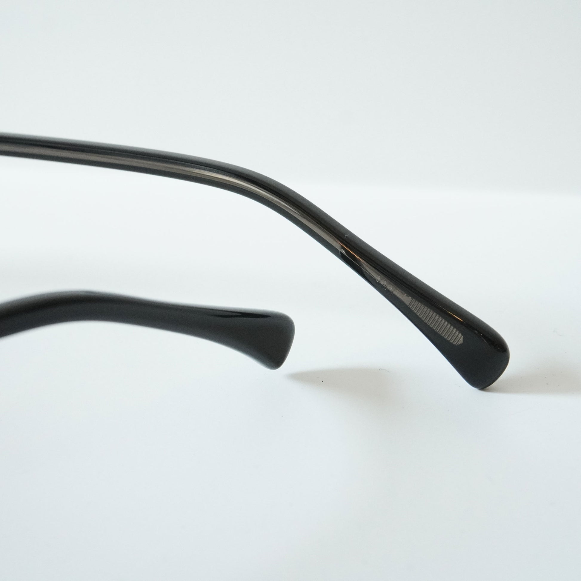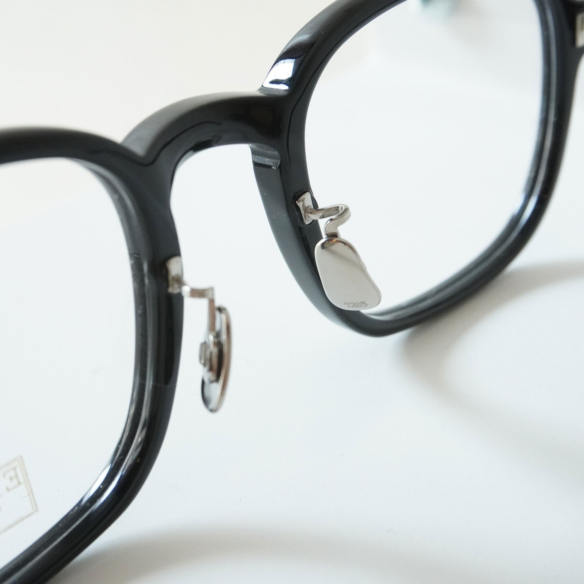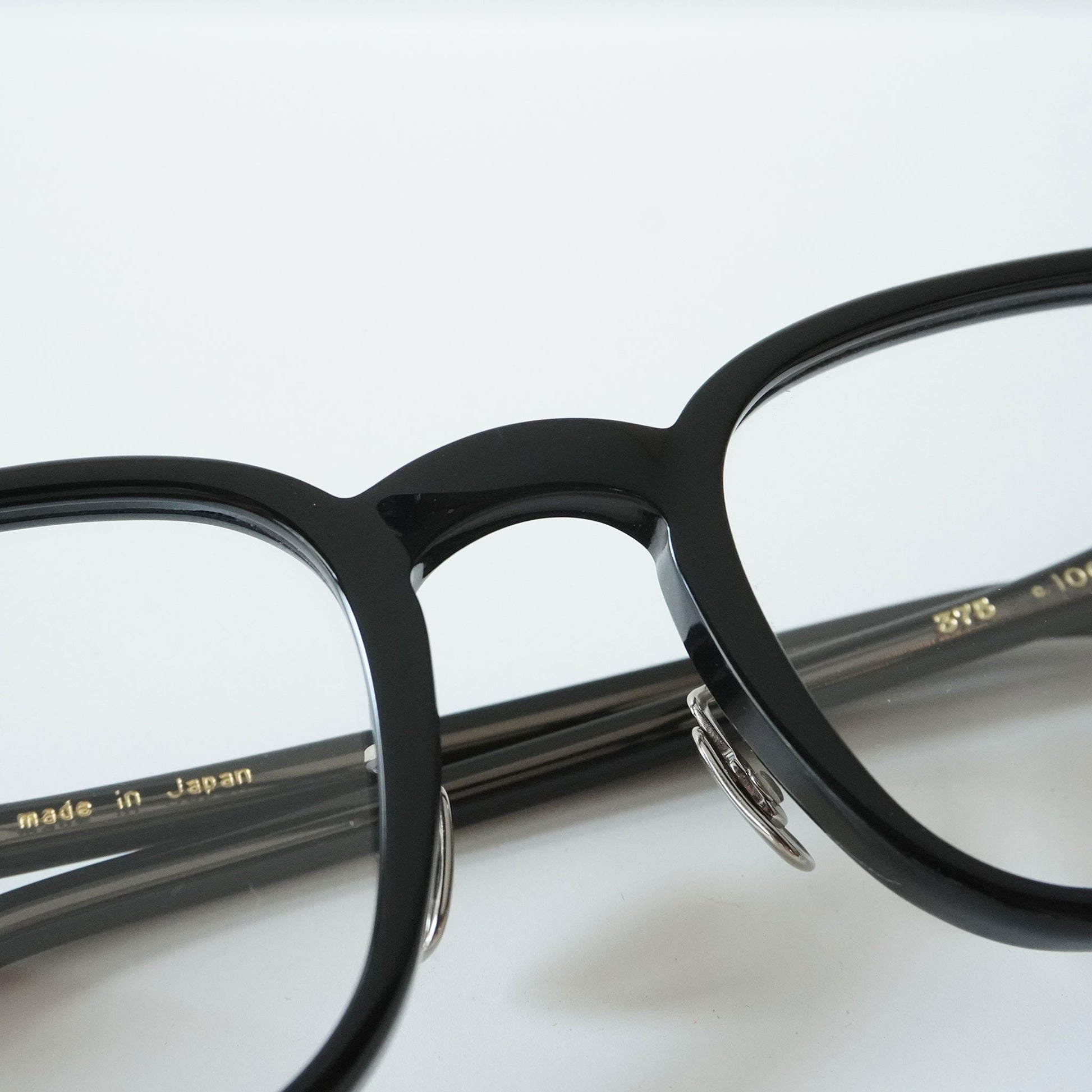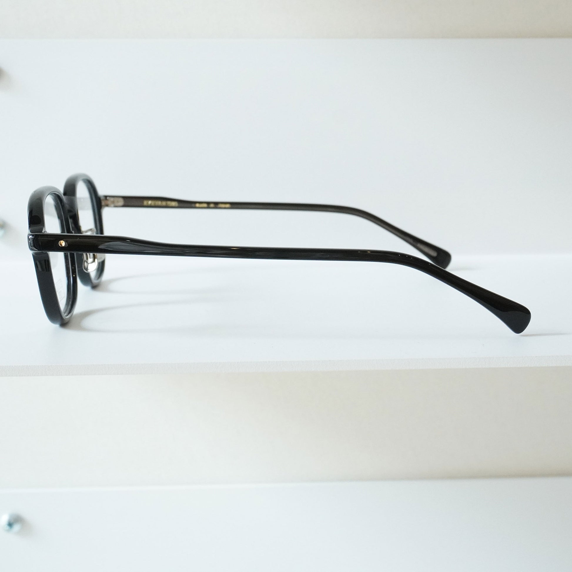 25SSでリリースした「365」型芯張りテンプルを採用したモデル。やや下がった智と柔らかい線で構成された温かみのあるスクエア シェイプは工場で使用する“カニメ”という呼称の治具に形が近いことから蟹目型と呼ばれている。合口部に向けて膨らんだ形状を有したテンプルは50年代のフレンチヴィンテージからサンプリングしたもの。華美なテンプル芯を見せることを目的とした芯張りではなく、シューティングでは作れない特徴的なテンプルのアウトラインを具現化する手段としてこの製法を用いた。ブランドのシグネチャーとなる埋め込み丁番1PINカシメ構造はK10のリベットを採用。執拗なまでのこだわりや創作思考を基調としながらも完成像は極めて静かな存在感に収めている。