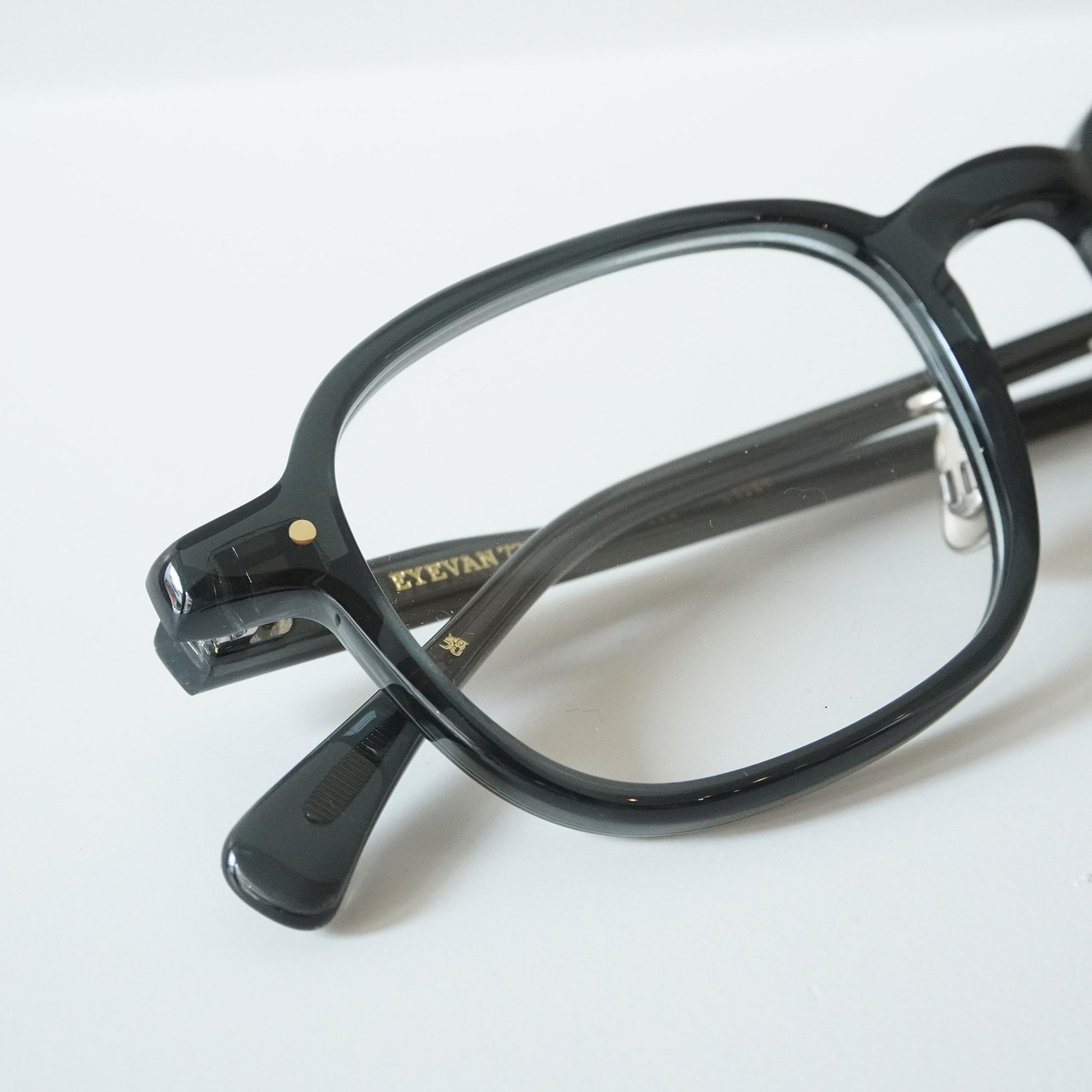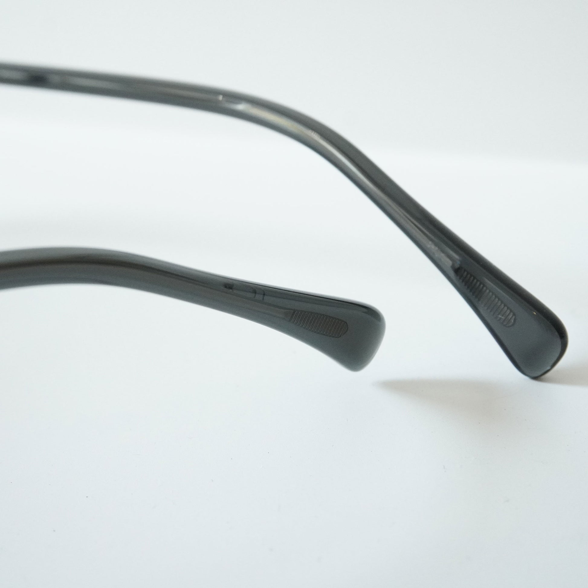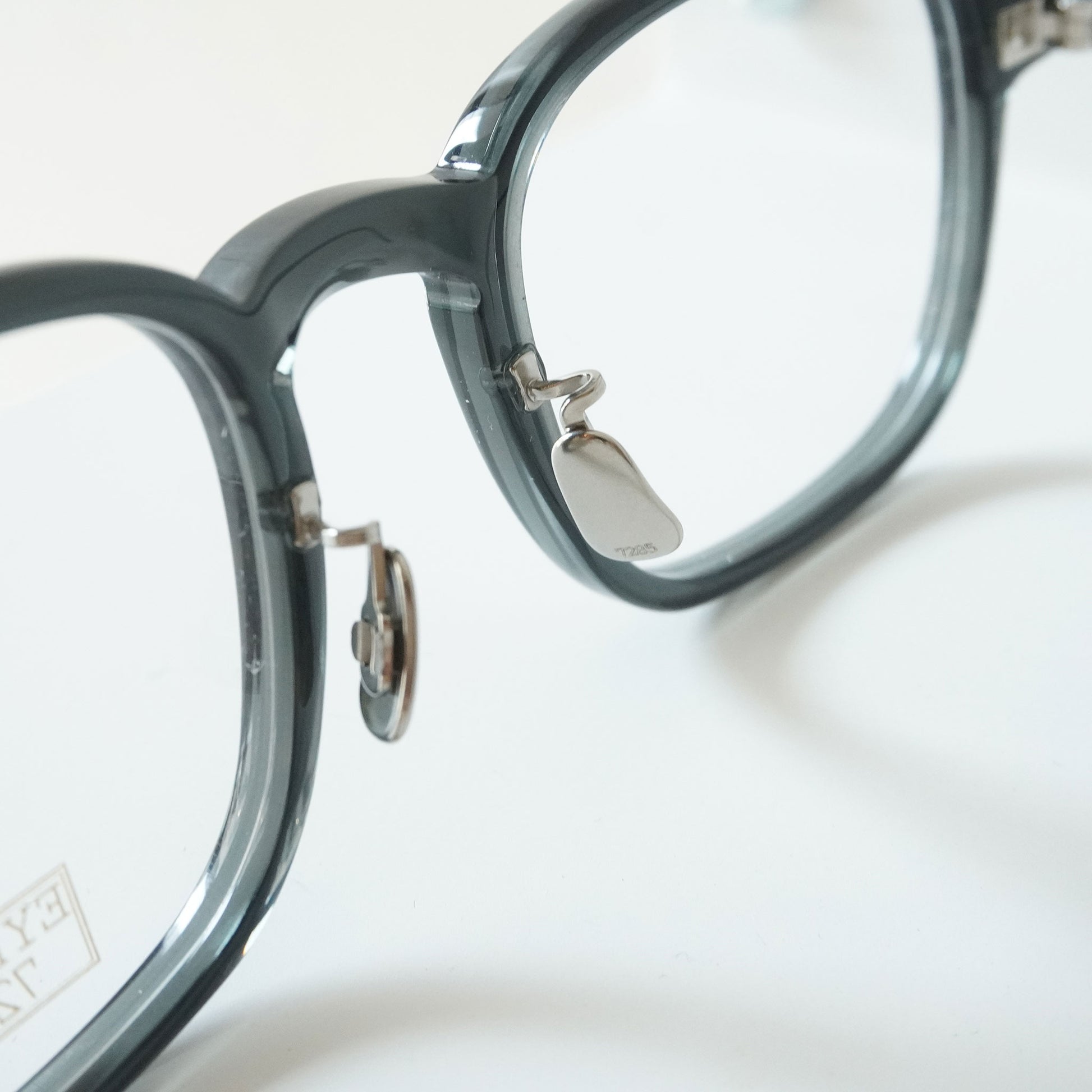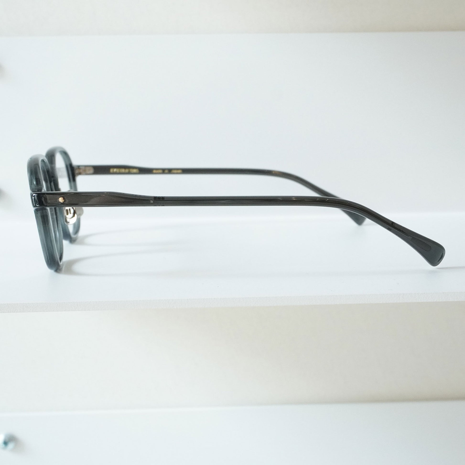 25SSでリリースした「365」型芯張りテンプルを採用したモデル。やや下がった智と柔らかい線で構成された温かみのあるスクエア シェイプは工場で使用する“カニメ”という呼称の治具に形が近いことから蟹目型と呼ばれている。合口部に向けて膨らんだ形状を有したテンプルは50年代のフレンチヴィンテージからサンプリングしたもの。華美なテンプル芯を見せることを目的とした芯張りではなく、シューティングでは作れない特徴的なテンプルのアウトラインを具現化する手段としてこの製法を用いた。ブランドのシグネチャーとなる埋め込み丁番1PINカシメ構造はK10のリベットを採用。執拗なまでのこだわりや創作思考を基調としながらも完成像は極めて静かな存在感に収めている。