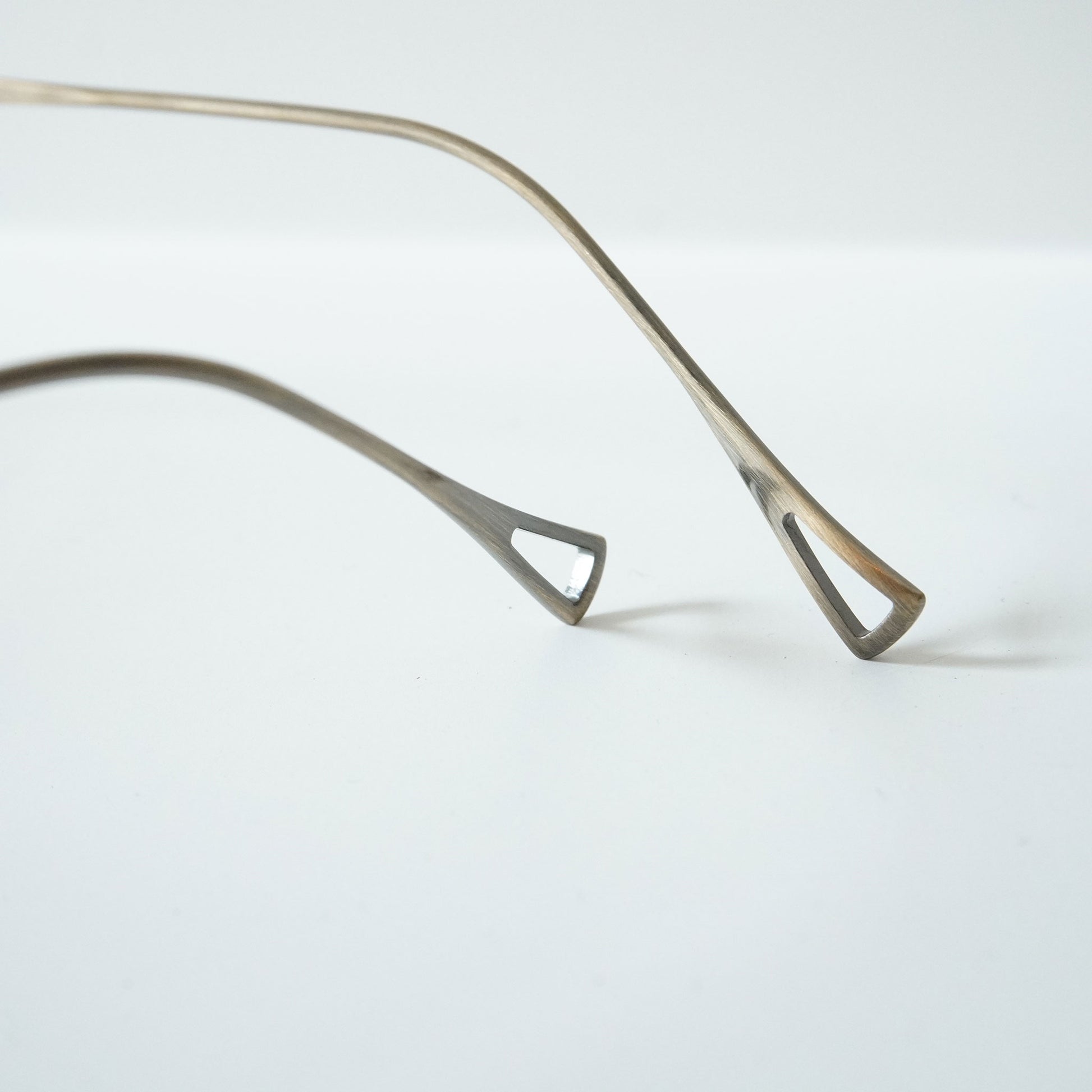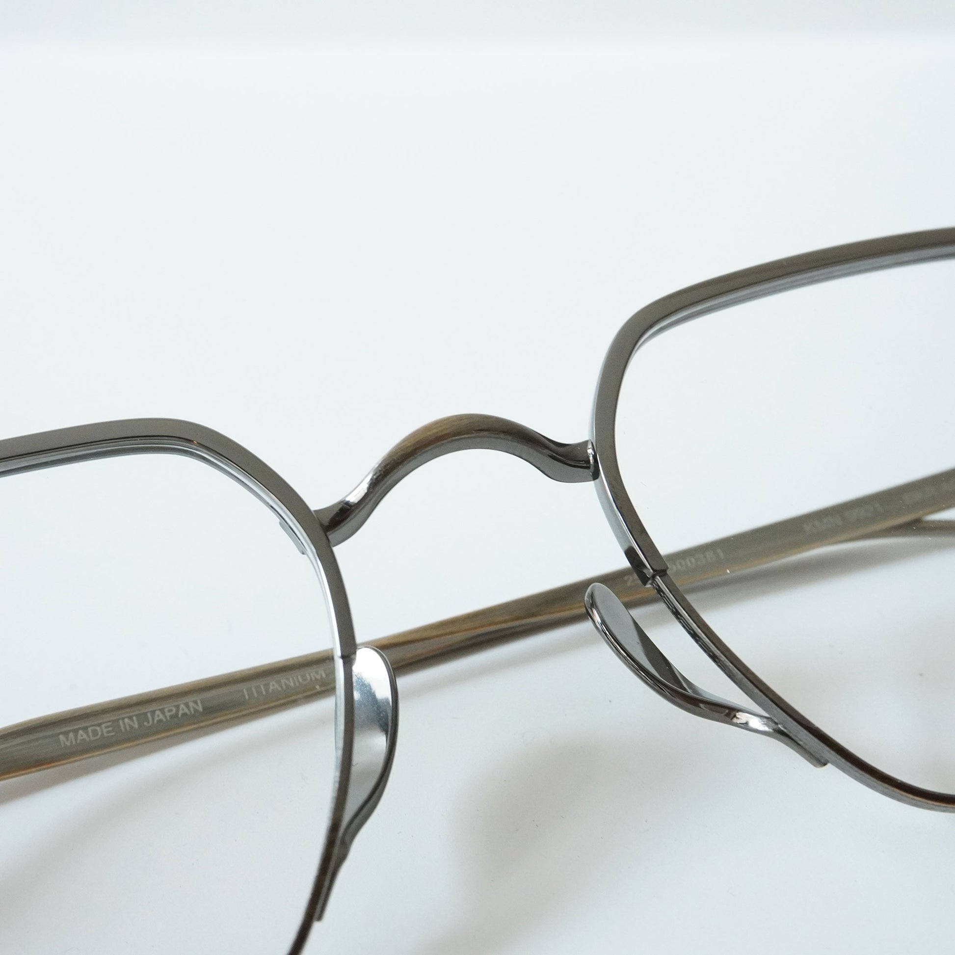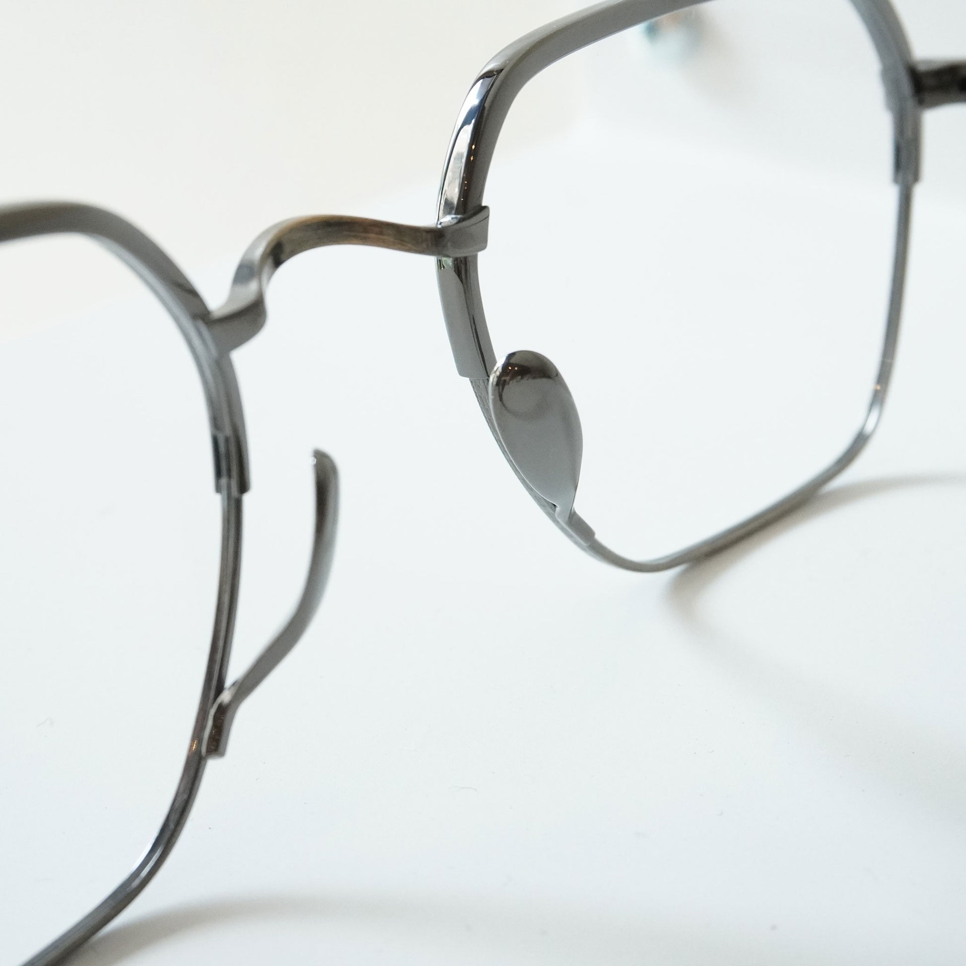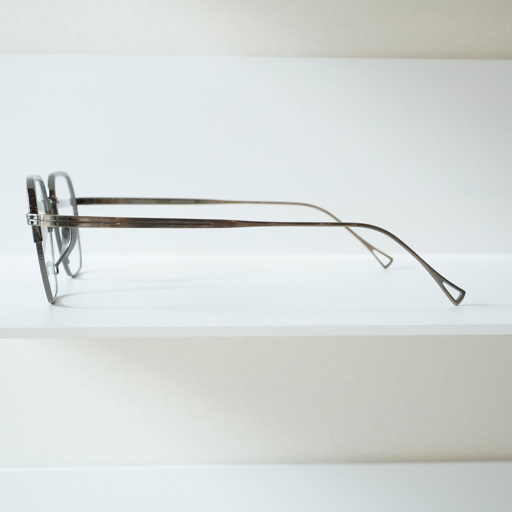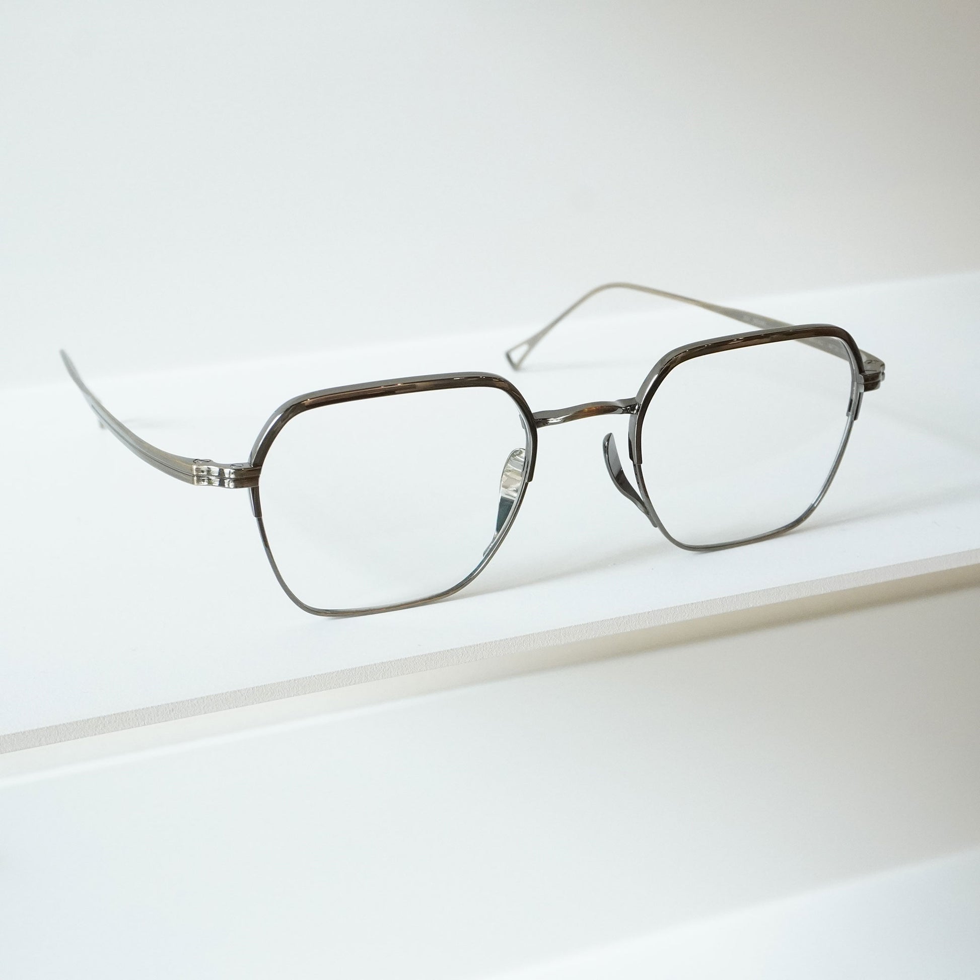 スクエアシェイプの上品なモデル。上部はメッキ塗装をしカラーの違いを楽しめるブローのようなデザインになっています。クラシックなデザインですが、やや大きめのサイズ感が今の時代に合うモデルです。