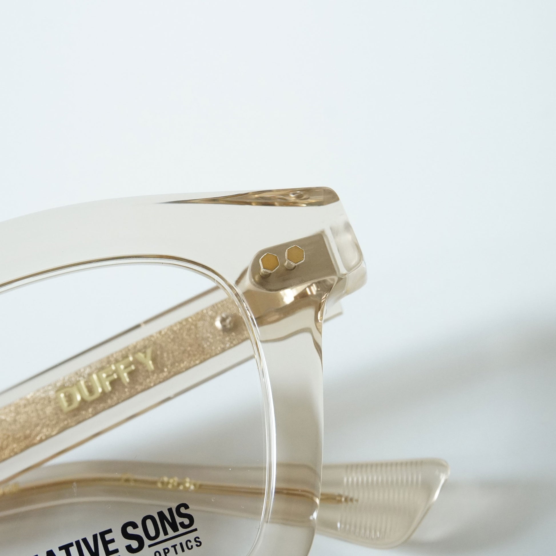 名前の由来: 故郷の近くにある頑固なアイルランド人のバーテンダーにちなんで名付けられたものです。ダフィーは頑固でタフな男で、このフレームもそれにちなんでタフな印象です。トップ ラインは眉に沿って丸みを帯びており、左右のレンズはテンプルの高さと同じノーズブリッジでつながっています。優しさとタフさを兼ね備えたフレームです。
