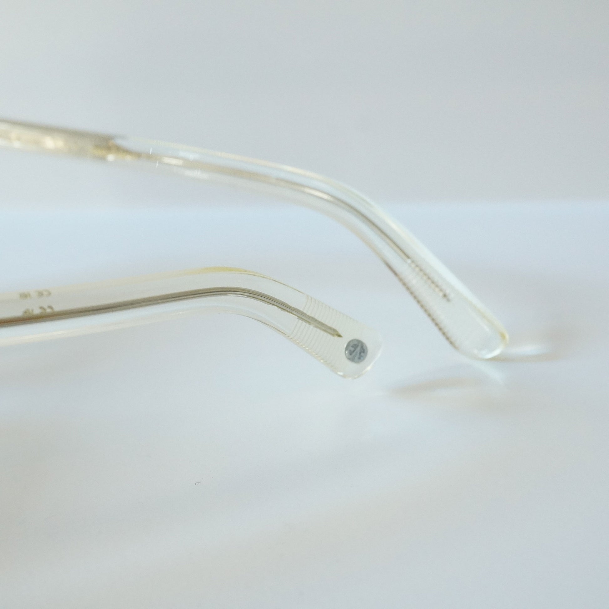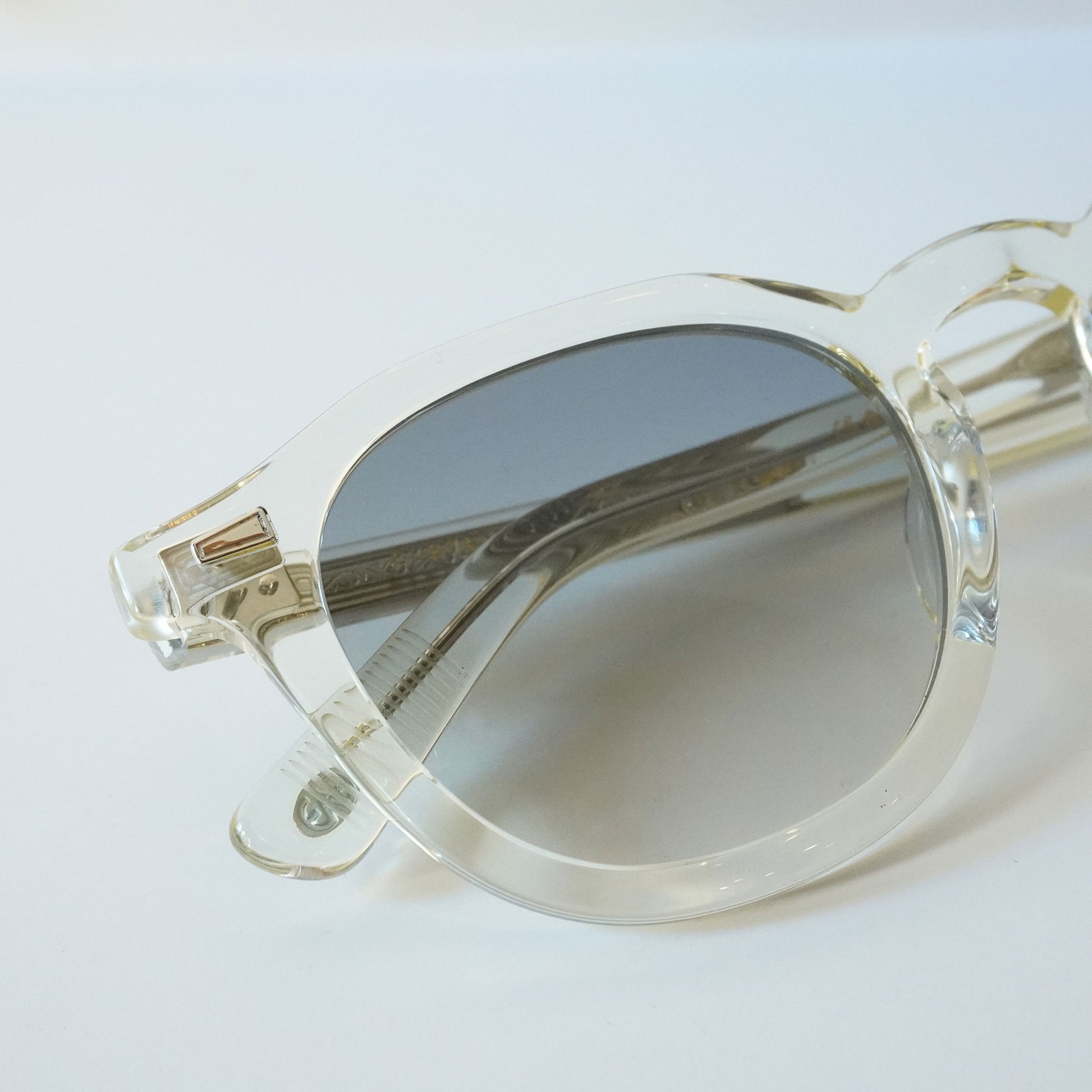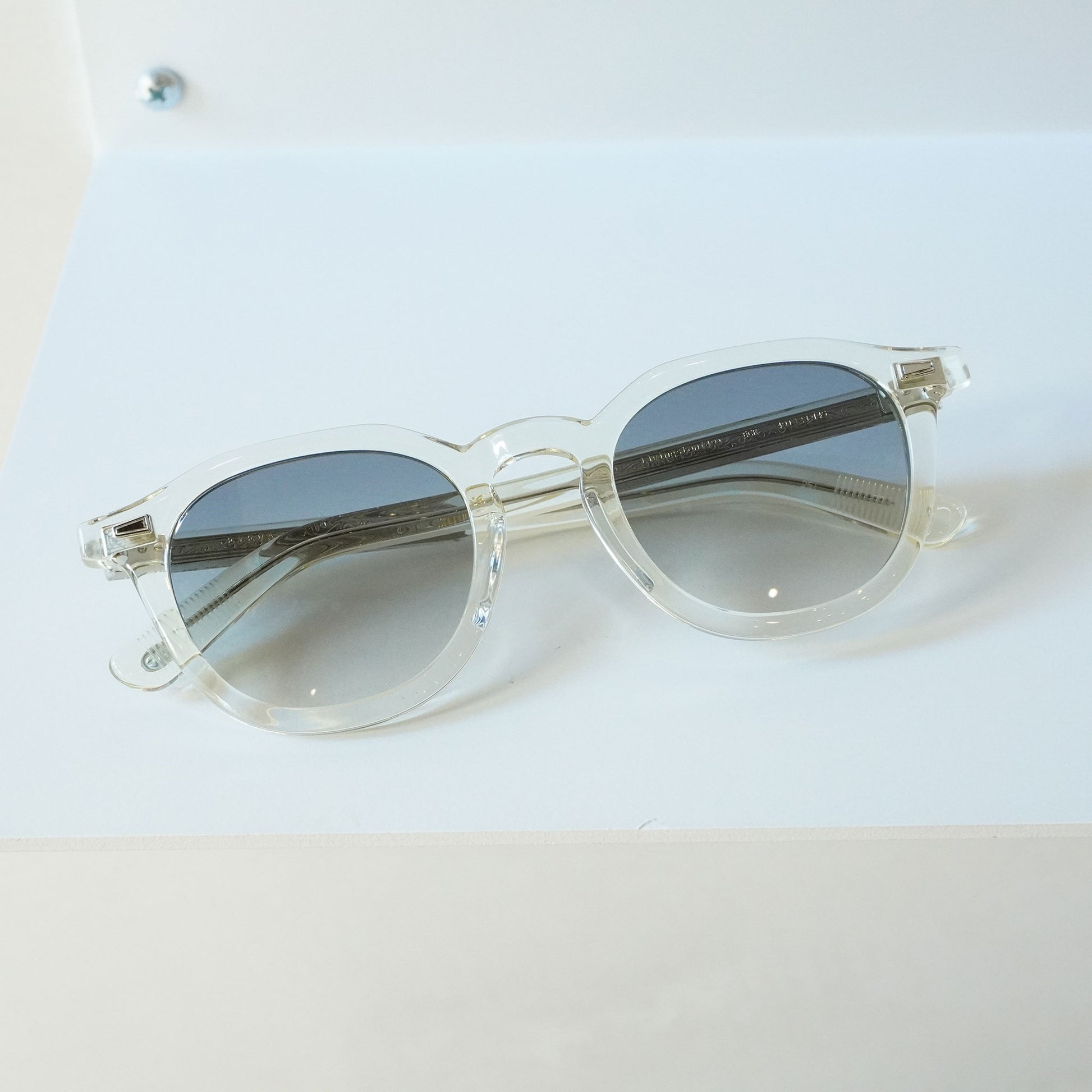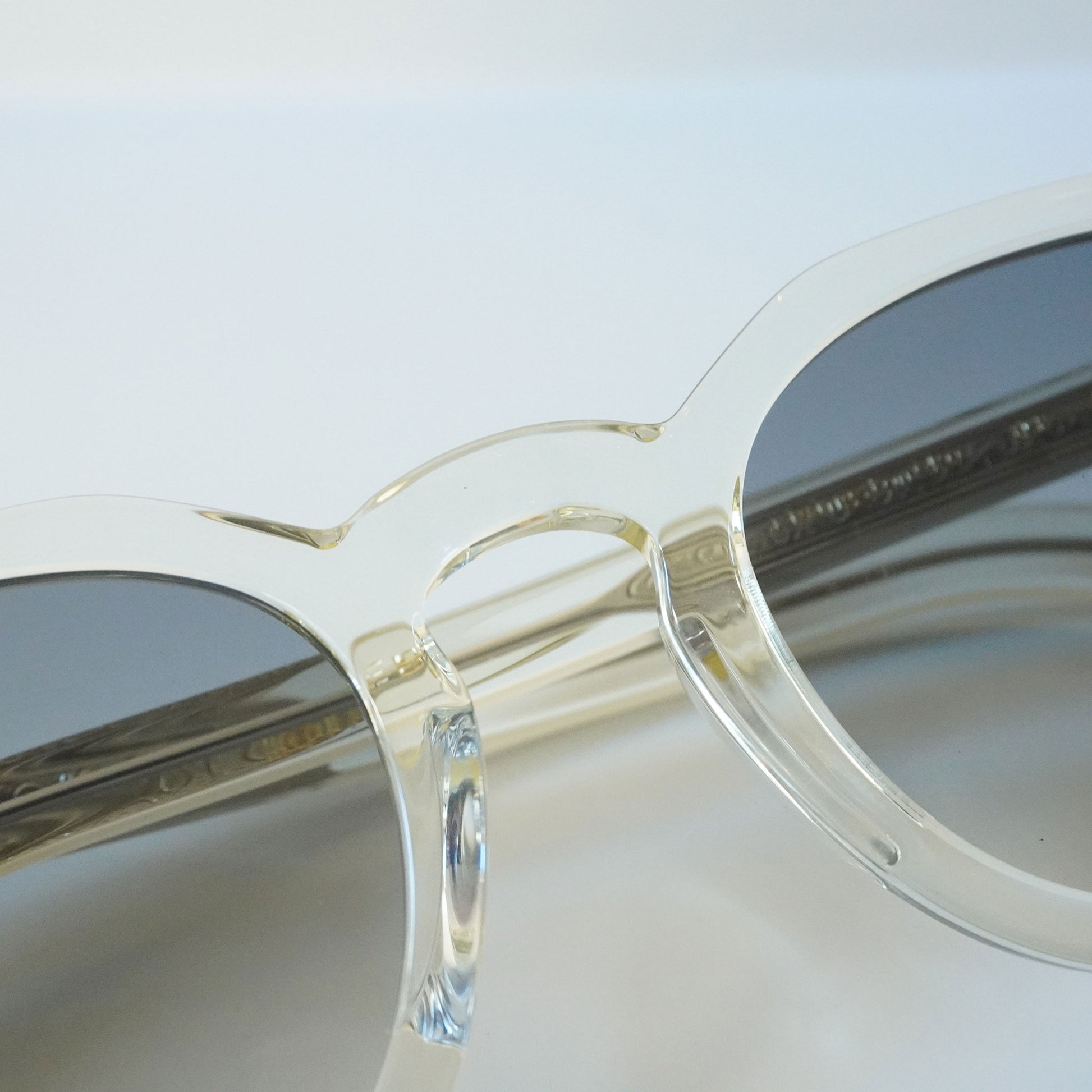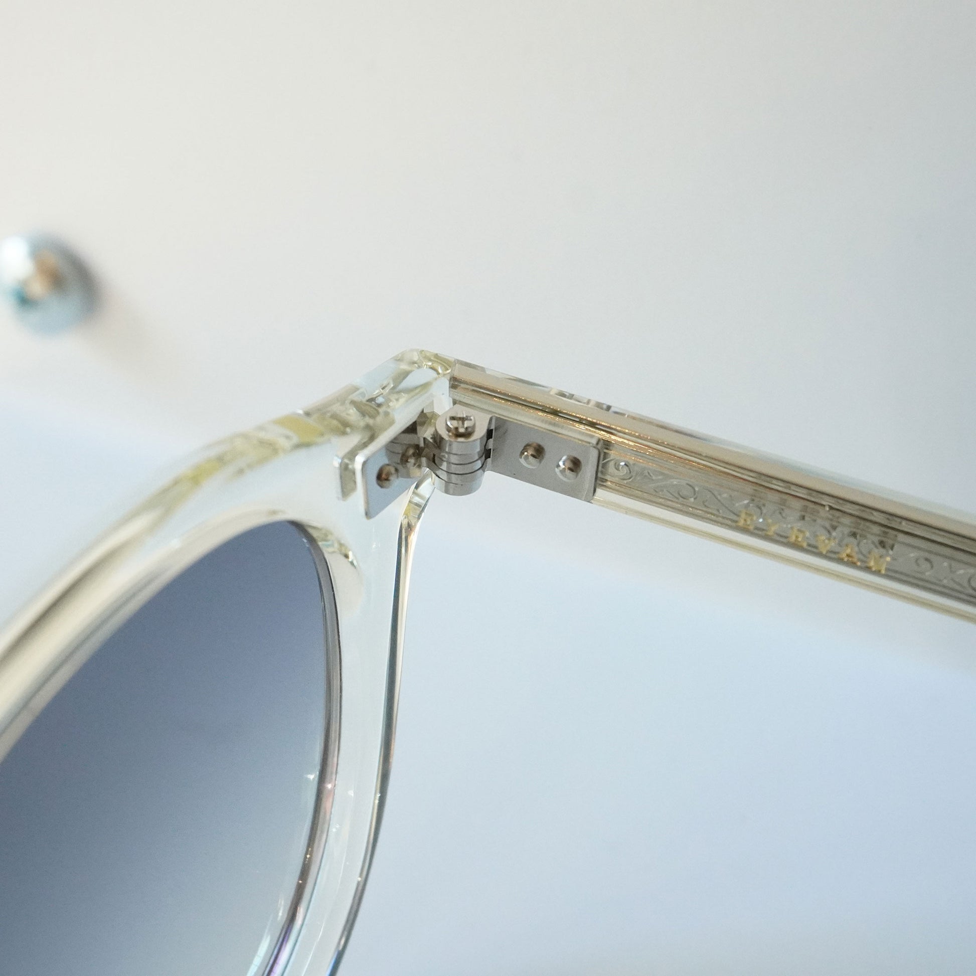 1950年代のフレンチヴィンテージをベースに、ウェリントンとクラウンパントの中間的なレンズシェイプをホーンリムに融合させた、2024SSシーズンモデル『Albedo』のリメイク。 リムはやや太めに再構築し、テンプルは新たなデザインを採用。ヨロイには成形精度に優れたサンプラチナを用い、通常の3倍以上のプレス工程を経て完成する、オリジナルのかしめ飾りを組み合わせた。サングラスレンズはオリジナルのCR39製、4カーブレンズを採用。
