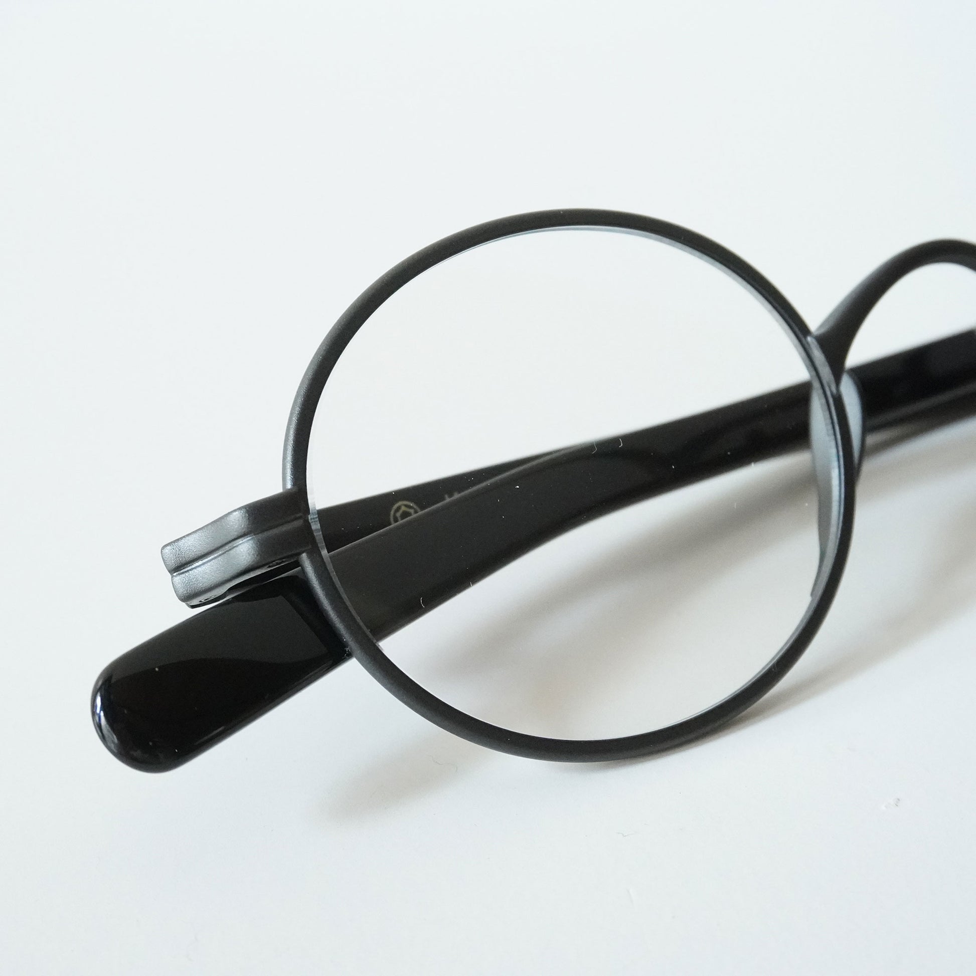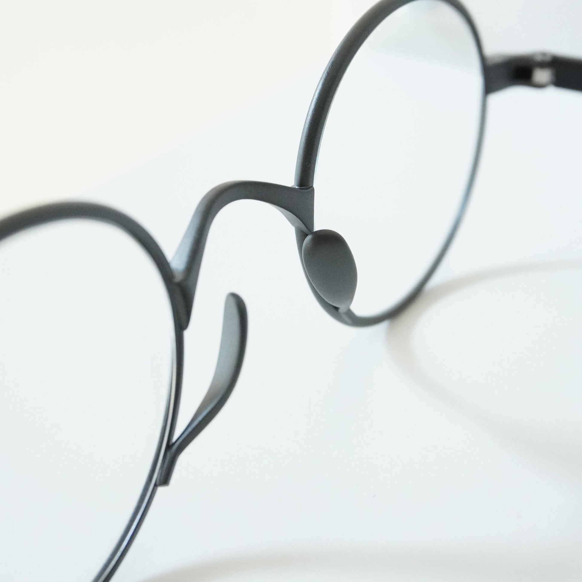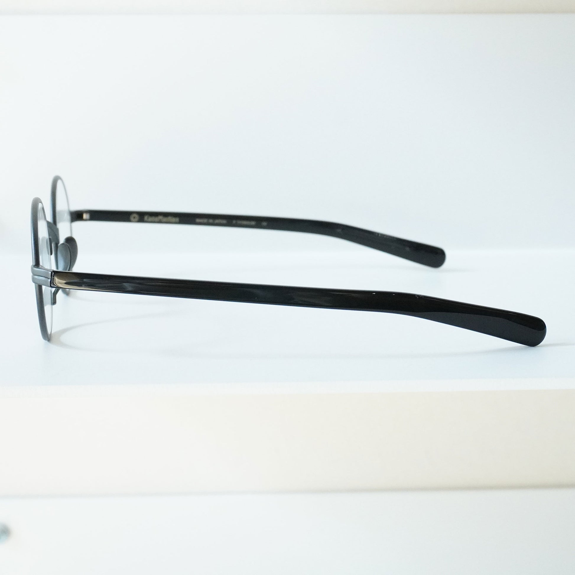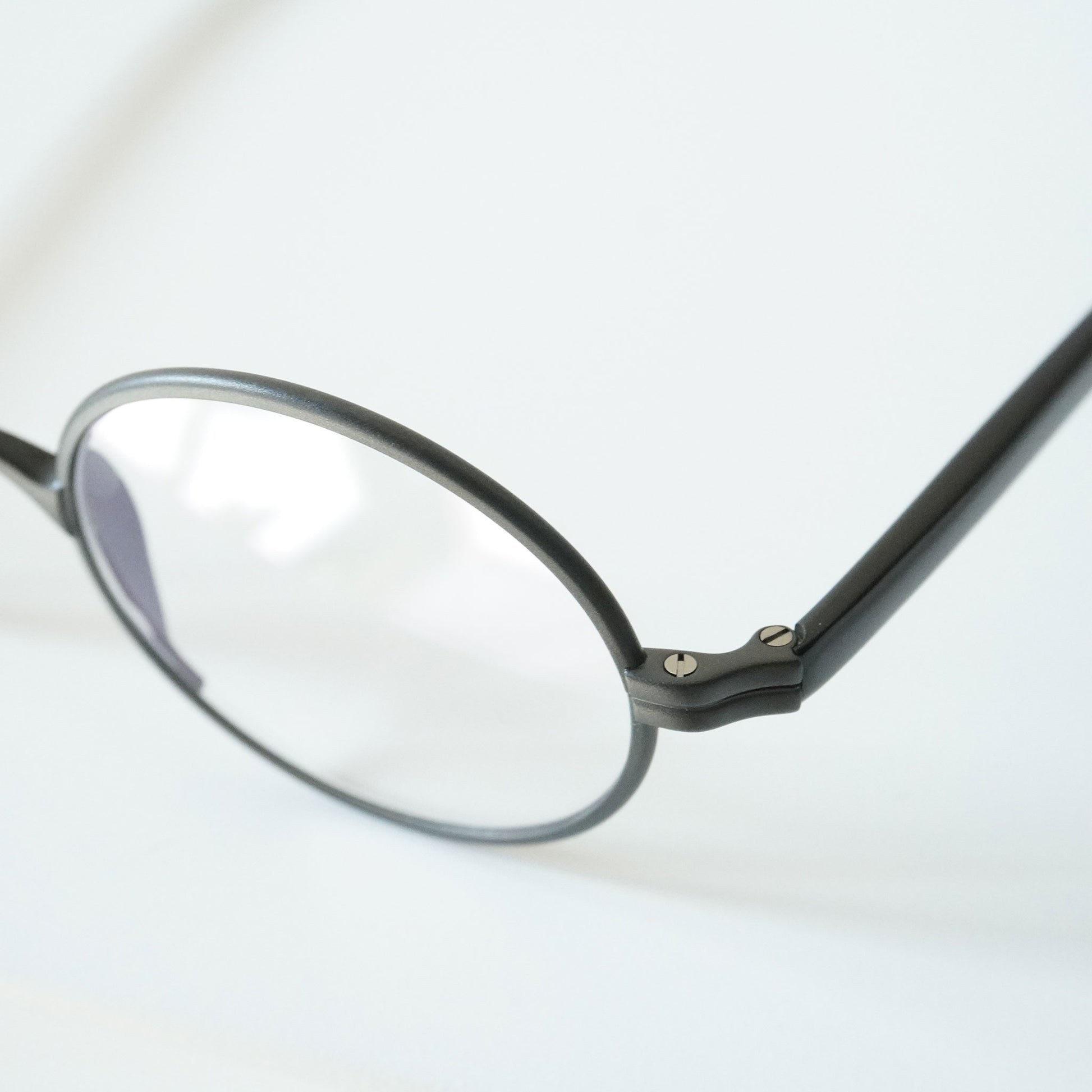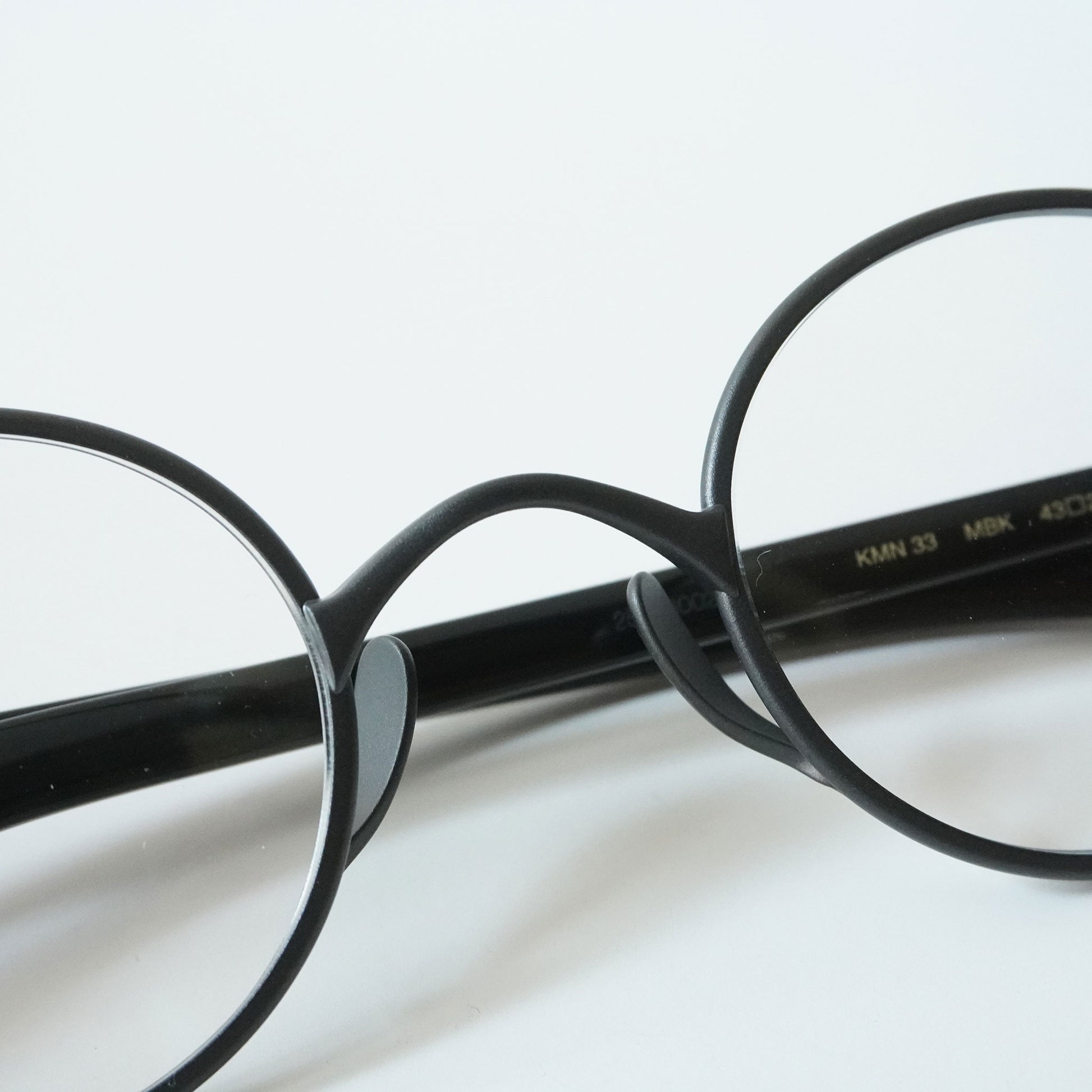 わずかに再生産されたぽってりと丸い丸メガネ。フロントはチタン、テンプルはアセテートと素材違いがクラシックな印象を引き立ててくれます。