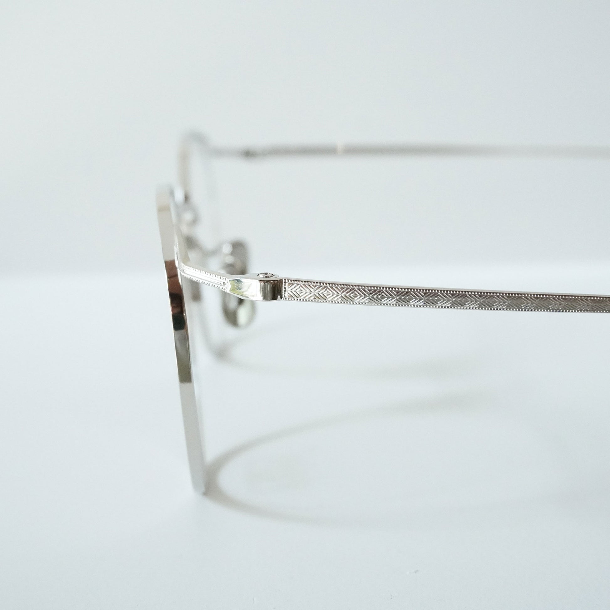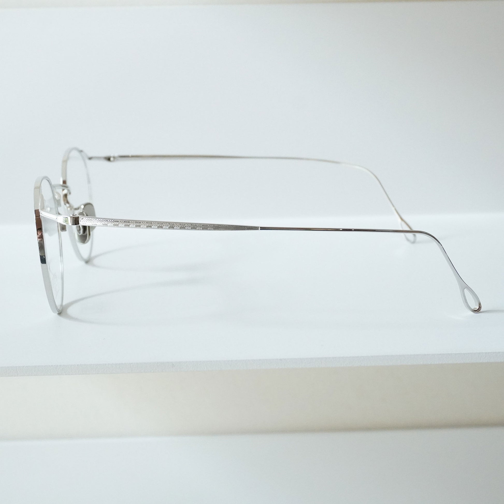 チタン板をリム線の様に見せる為、表裏からミル打ちのプレスを入れながら、鼻裏側にブローチを一体で成形した。3mmのチタン板を肉寄せし4mmに膨らませてブローチの形状にするという画期的に構造を具現化させる事ができた。これにより智元にレンズ止めネジが不要になり高い位置に智を設定させた独自性のあるデザインを生み出す事が出来た。