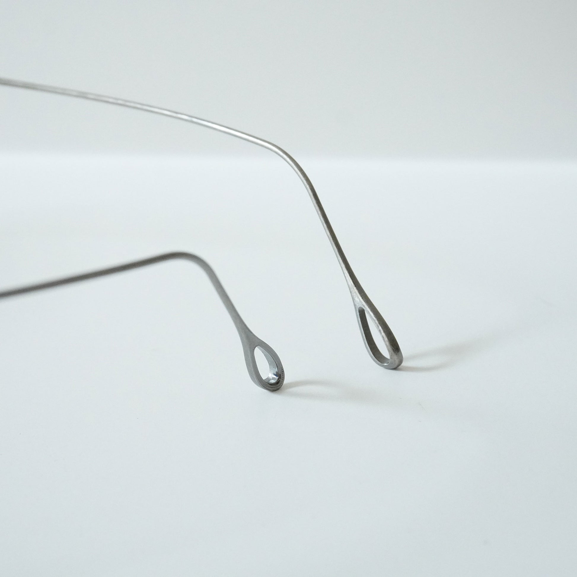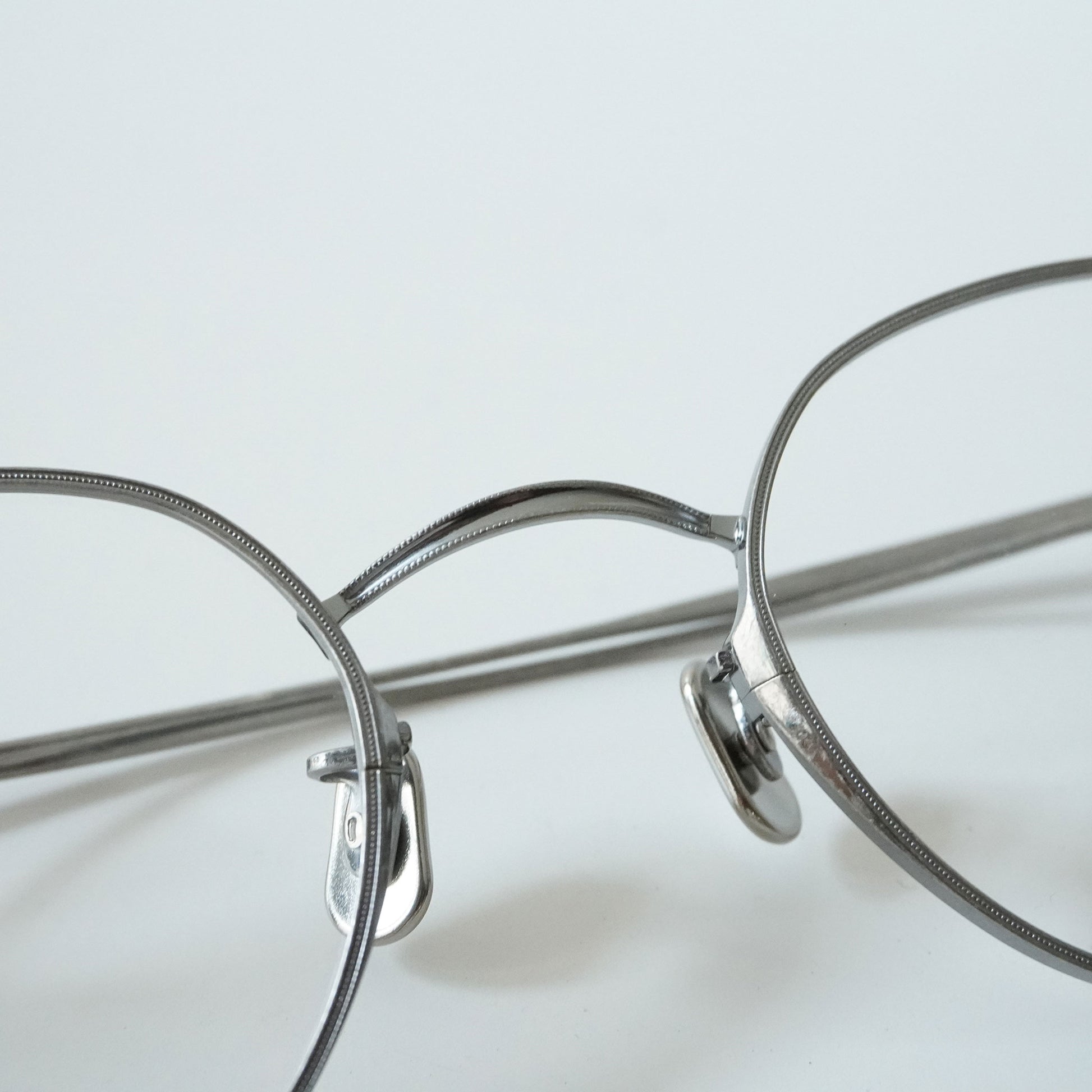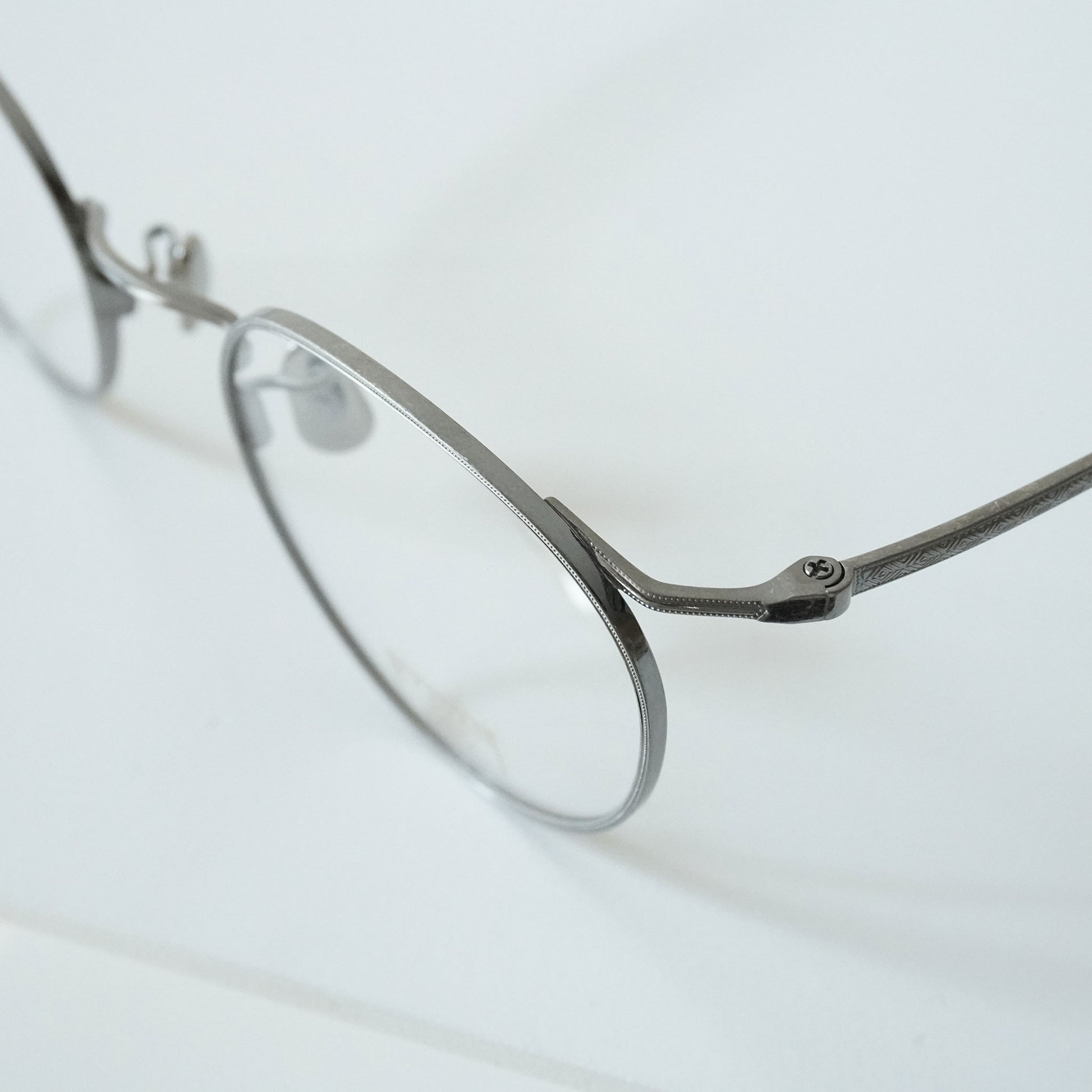 チタン板をリム線の様に見せる為、表裏からミル打ちのプレスを入れながら、鼻裏側にブローチを一体で成形した。3mmのチタン板を肉寄せし4mmに膨らませてブローチの形状にするという画期的に構造を具現化させる事ができた。これにより智元にレンズ止めネジが不要になり高い位置に智を設定させた独自性のあるデザインを生み出す事が出来た。